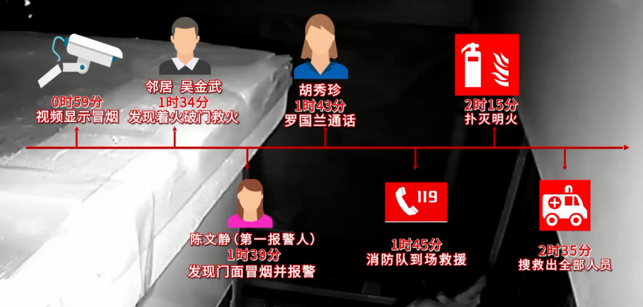 通过现场监控看到,当日0时59分,房间内就有烟气冒出,1时34分,其邻居也发现了火情,但直到1时39分,路人才拨打了第一个119报警电话,1时43分,其邻居还在与被困人员通话。如果被困人员发现火情后,能够第一时间拨打119电话报警,也许惨剧就不会发生。