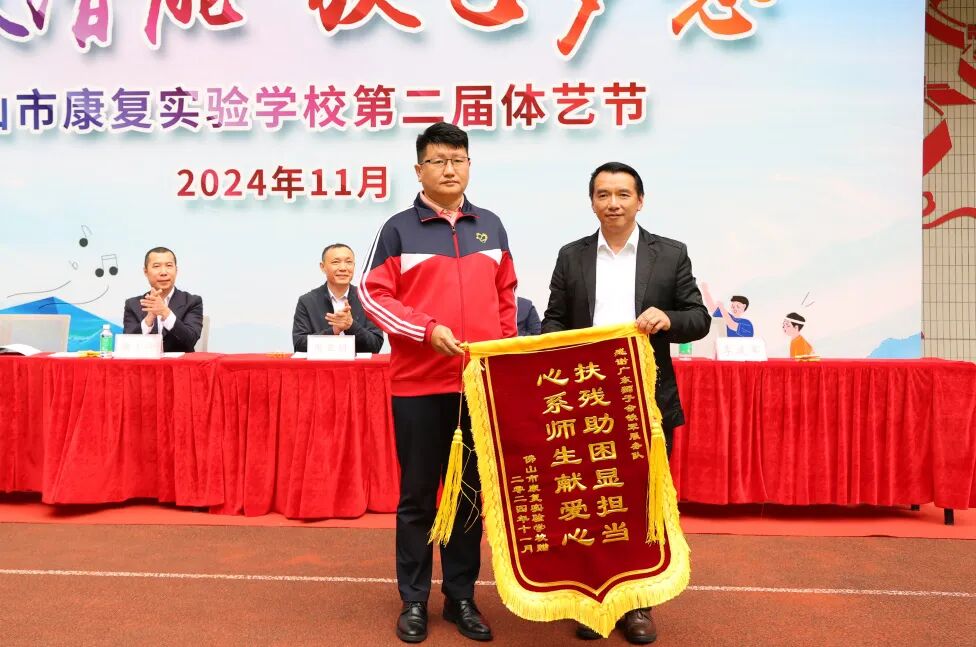 紧接着,佛山市康复实验学校校长董锋堂代表学校致辞。他重点提到:作为全市唯一一所重度残疾儿童教育学校,佛山市康复实验学校在课程改革上不断探索,积极推进“五育融合”工作,构建了“一日生活”常规教育体系。过去一年,孩子们在认知、社交、自理能力等方面取得令人欣喜的进步,而体艺节是对教学成果的展示、对师生素质的检验,希望全体同学以饱满的热情投身其中。随后,董锋堂向广东狮子会铁军服务队和佛山市智力残疾人及亲友协会分别回赠了锦旗和感谢状,由衷感谢他们对本届体艺节的大力支持。