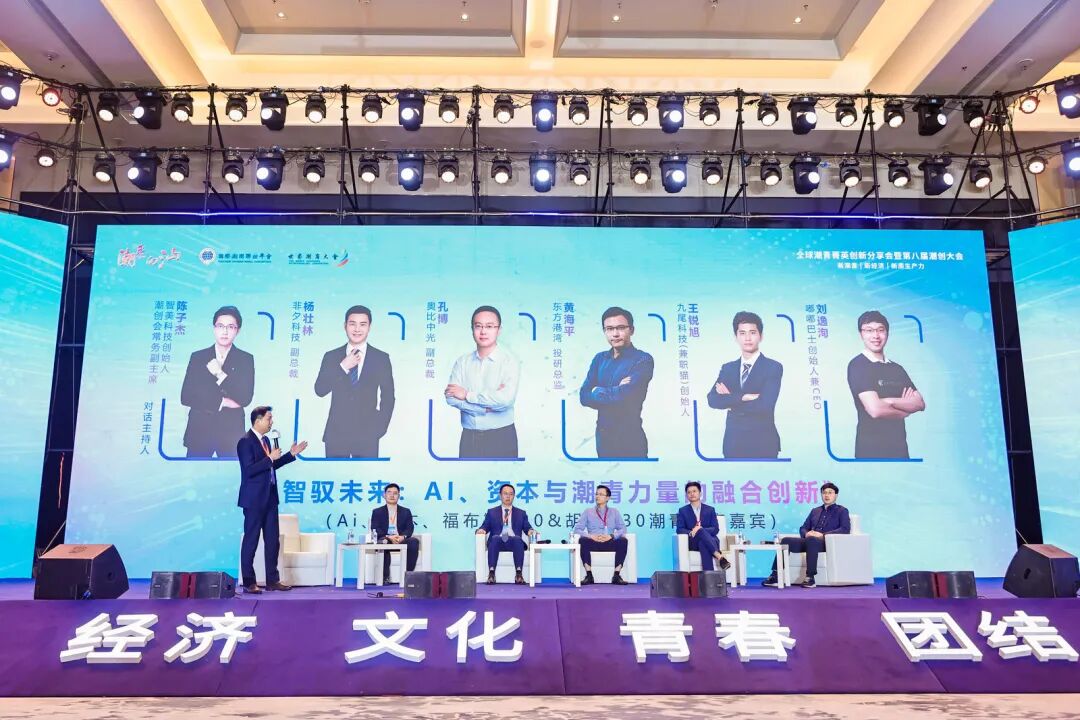 在智汇潮青圆桌对话环节,大会邀请到了非夕科技副总裁杨壮林,奥比中光副总裁孔博,东方港湾投研总监黄海平,九尾科技(兼职猫)创始人王锐旭和嘟嘟巴士创始人兼CEO刘逸洵作为杰出潮青代表,和主持人共同探讨主题为《智驭未来:AI、资本与潮青力量的融合创新》的新思路。