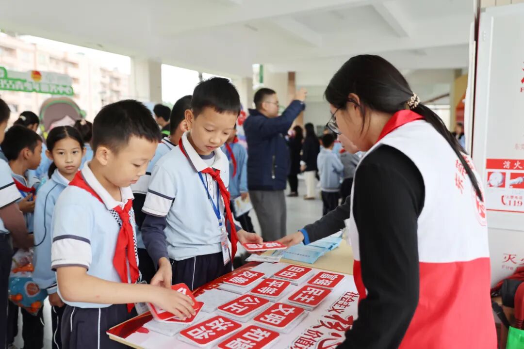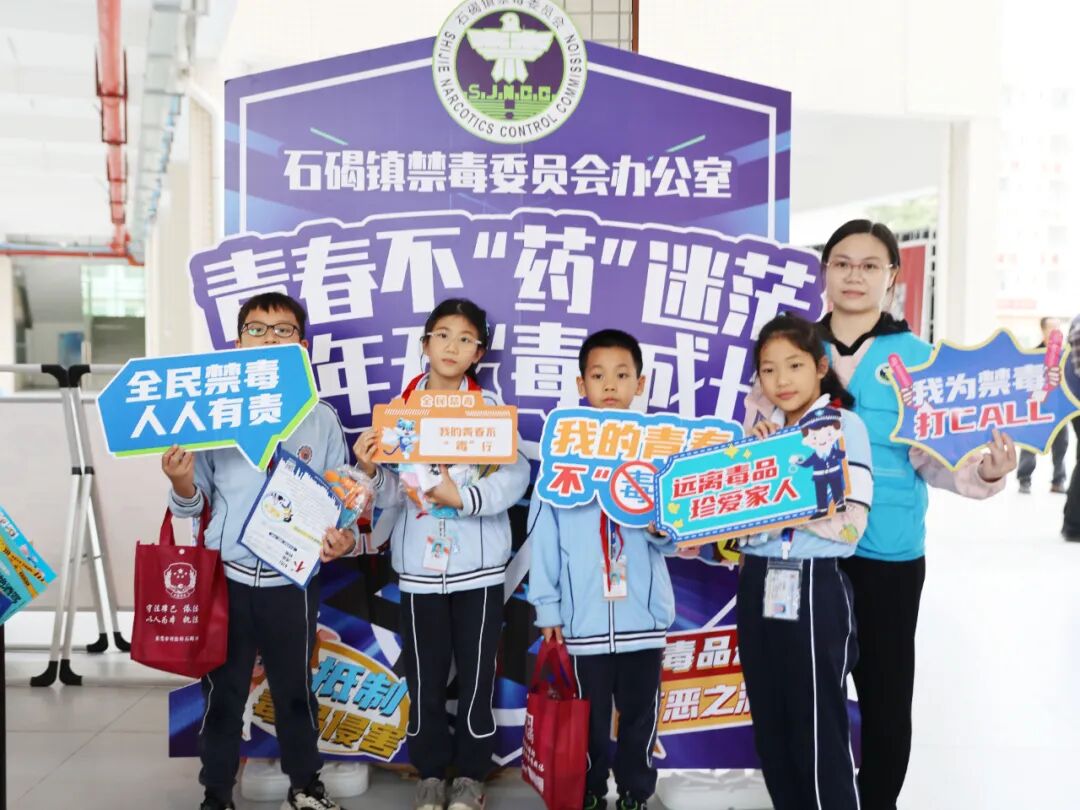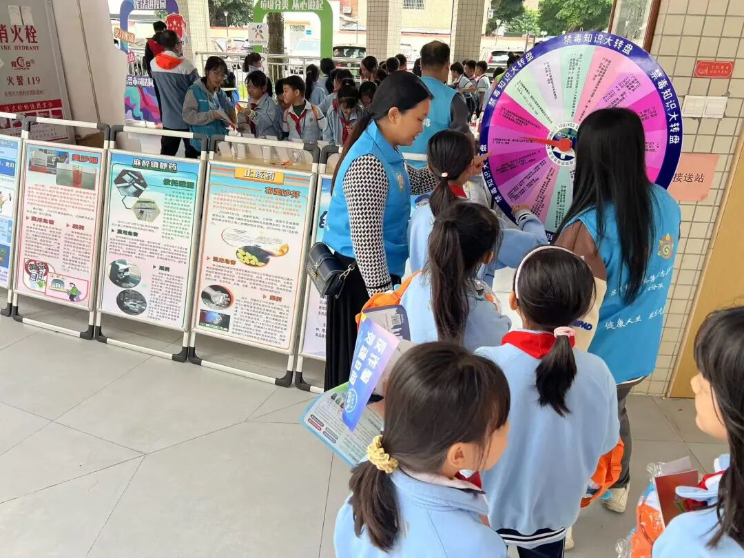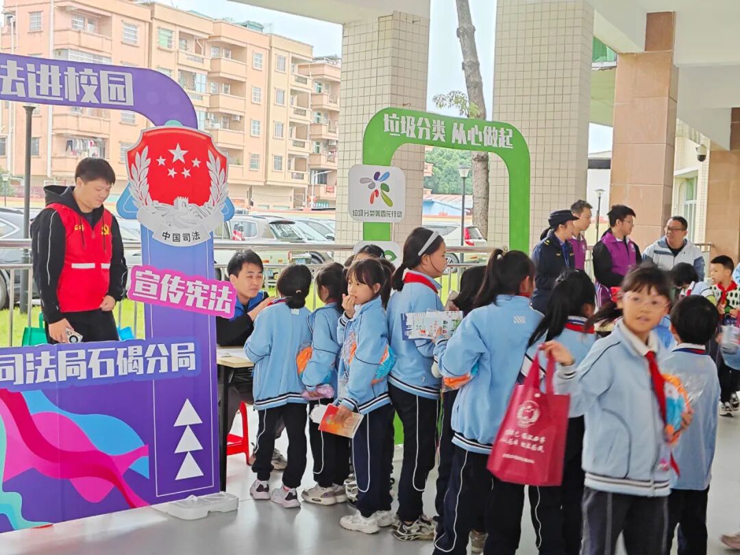 当天下午,石碣袁崇焕阳光小学校园分外热闹。镇新时代文明实践中心联合镇宣教文体旅游办、禁毒办、反诈办、司法分局、团委、交警等部门集体“出摊”,为学生们送上一道特别的知识“大餐”。