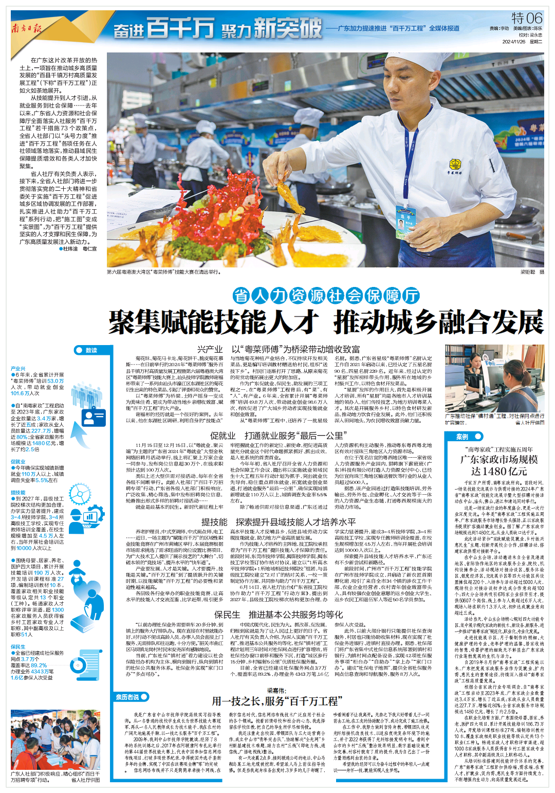 编者按:近年来,广东人社部门从“兴产业”“促就业”“提技能”“保民生”等方面持续发力,为“百千万工程”提供坚实的人才支撑和民生保障。请看南方日报文章《省人力资源社会保障厅:聚集赋能技能人才 推动城乡融合发展》。