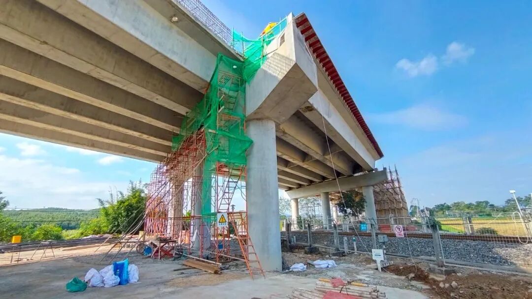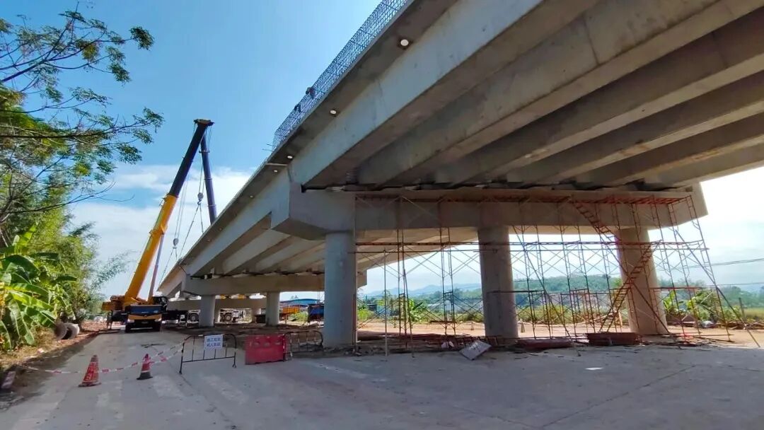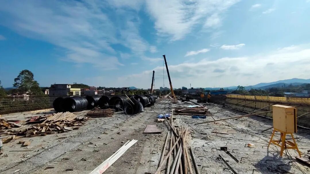 如今,广茂线新桥西道口“立交桥”已初具规模。施工人员分布在各作业面忙碌着,两台重型吊车在管理人员的指挥下,正在进行桥东侧联箱梁支架搭建;桥西侧正在进行路面铺设;桥面正进行防护栏钢筋绑扎和模板铺设。