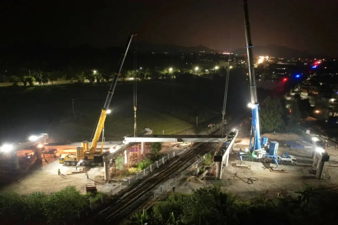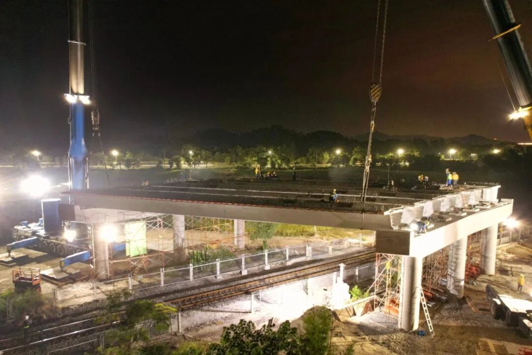 “我们对施工方案进行了优化,先架好跨铁路主跨梁,再往两侧延伸,增加工作面。同时,增加了3个施工班组和投入相应设备,待照明设施准备完毕,增加的施工班组会增加4小时的夜间施工时间,在保证安全和质量的前提下,尽量把建设进度往前赶。”
