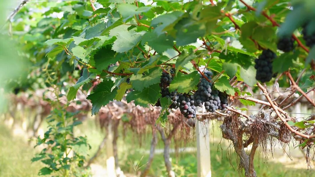 一串串紫黑色的夏黑葡萄挂满枝头