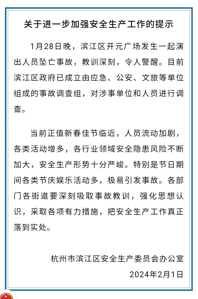 2月1日,@滨江发布 微博通报,1月28日,浙江杭州滨江区开元广场前一名女子在进行杂技表演时从高空处坠落身亡。