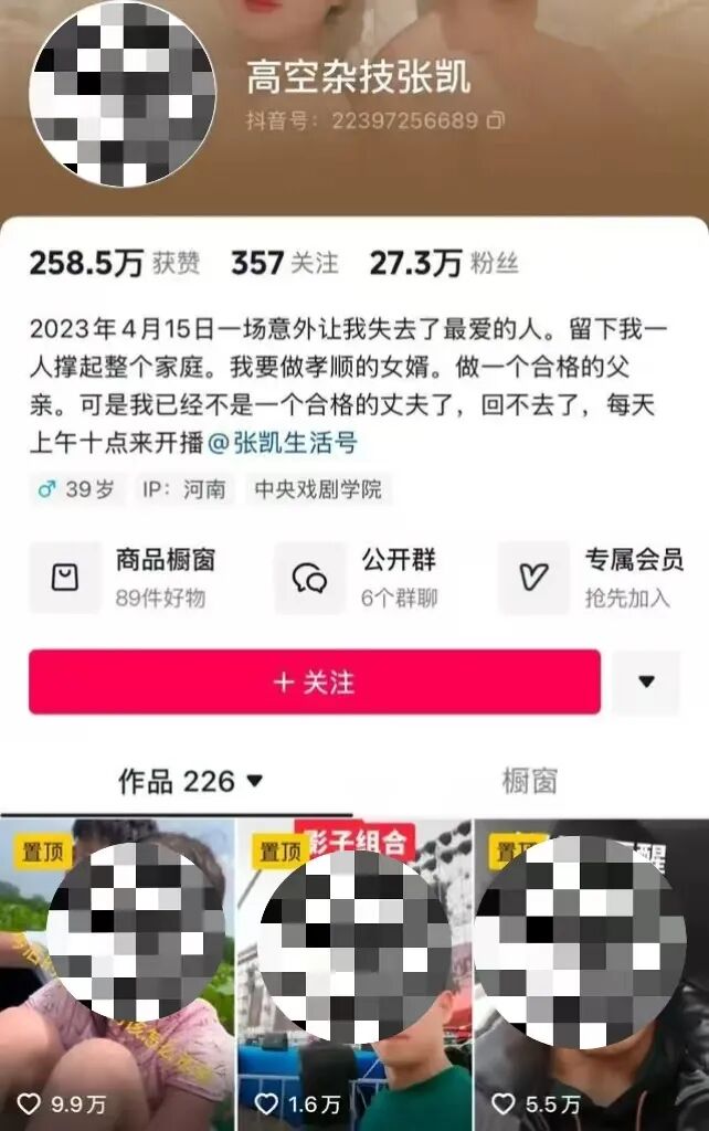 张凯的账号目前有27万粉丝,他在个人签名写道:“2023年4月15日一场意外让我失去了最爱的人,留下我一个人撑起整个家庭。”