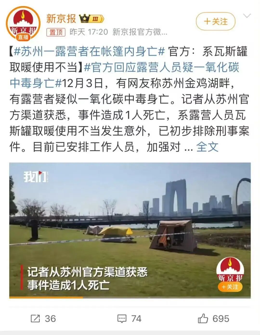 现场视频显示,苏州东方之门附近一处湖边的草坪上有多个简易帐篷,工作人员正在拉警戒线。视频发布者配文称:“玲珑湾小区附近,女子露营时使用卡式炉取暖,没做好通风,不幸去世。”