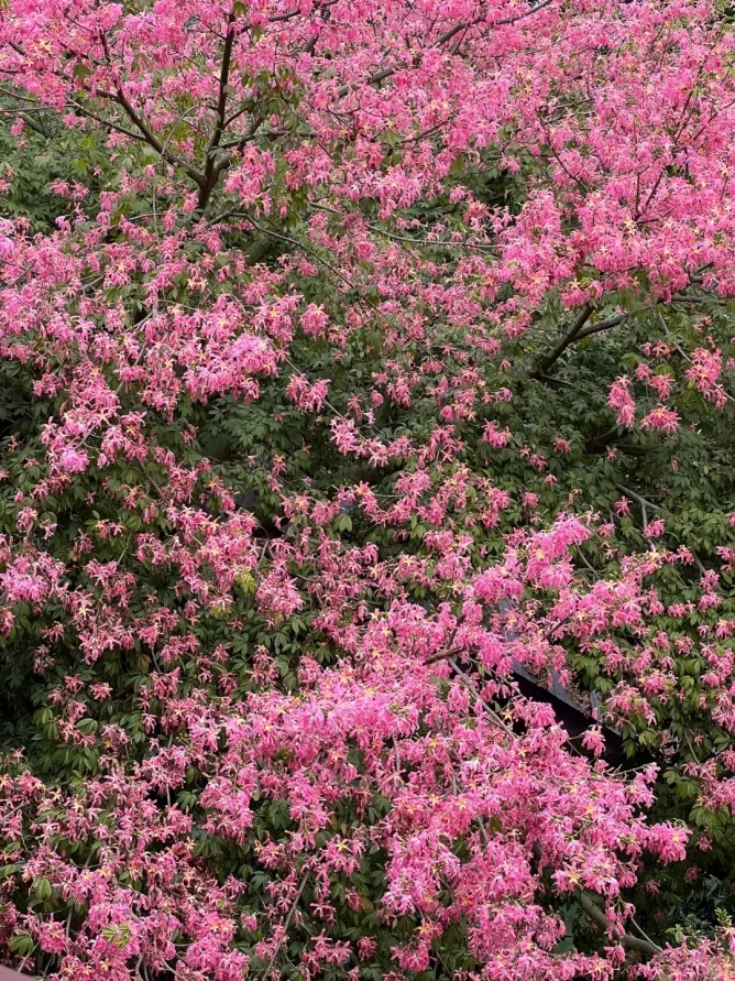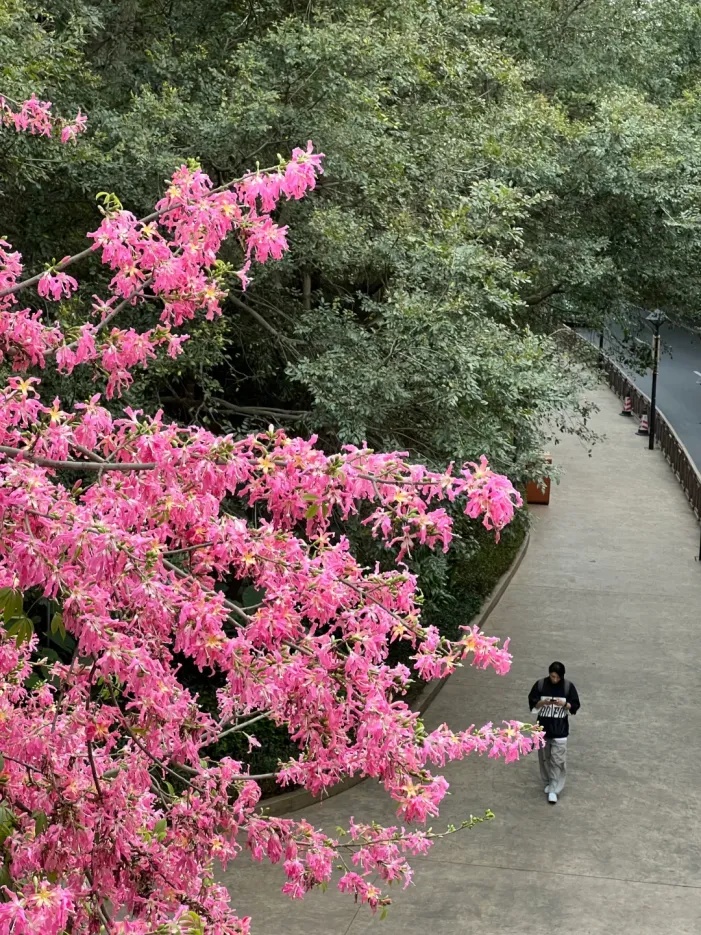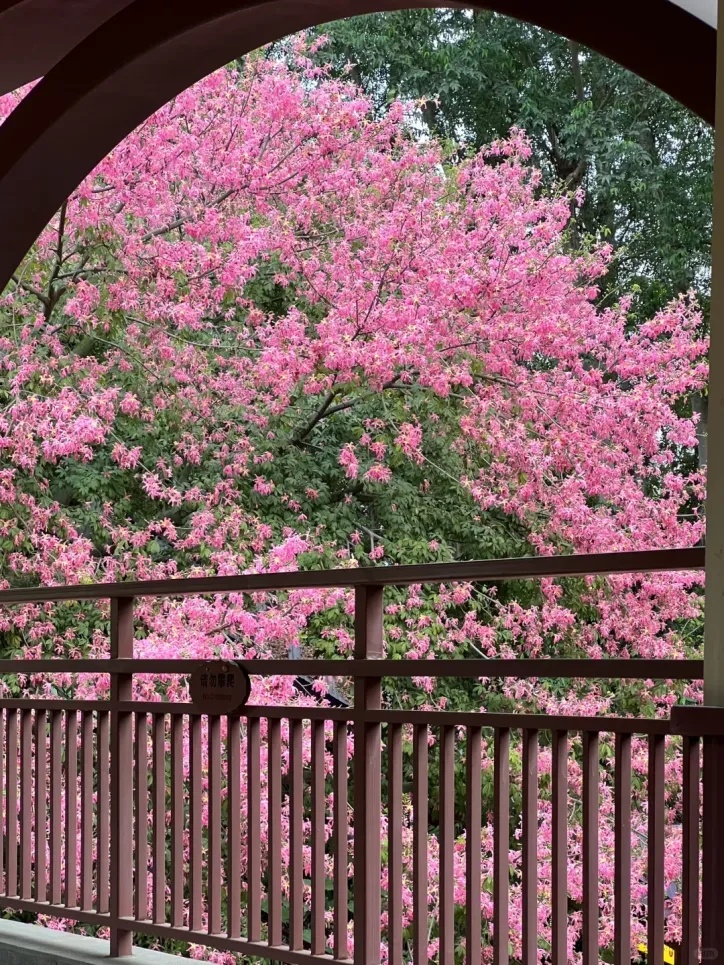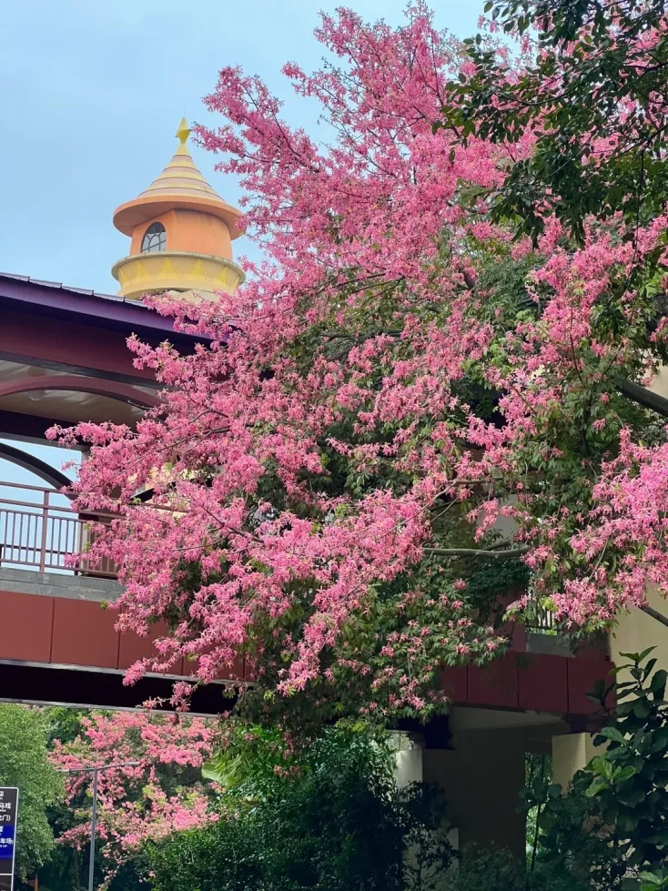 从长岗山庄走出来,站在长隆熊猫酒店旁边的人行天桥,仿佛伸手可触达异木棉。被拱门框住的异木棉溢出画面的粉,如同一幅超美巨型的油画。