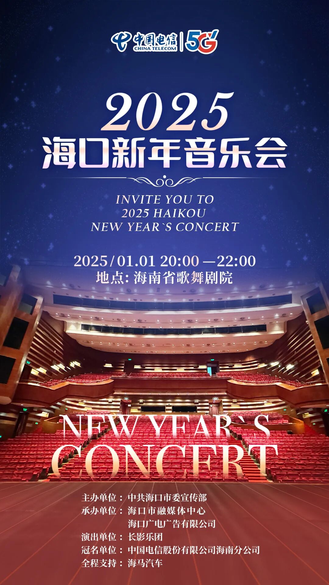 随着新年的脚步日益临近,2025海口新年音乐会即将奏响。本次音乐会由中共海口市委宣传部主办,海口市融媒体中心与海口广电广告有限公司承办,演出由享有盛誉的长影乐团担纲。音乐会将于2025年1月1日、2日在海南省歌舞剧院精彩上演。