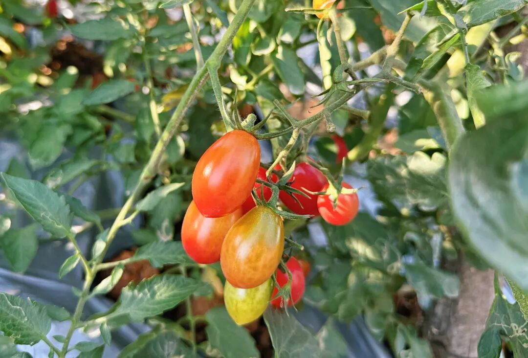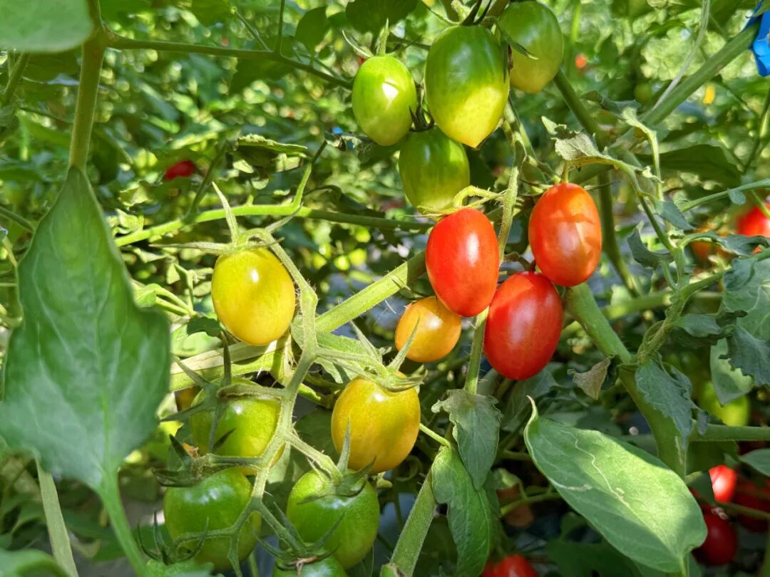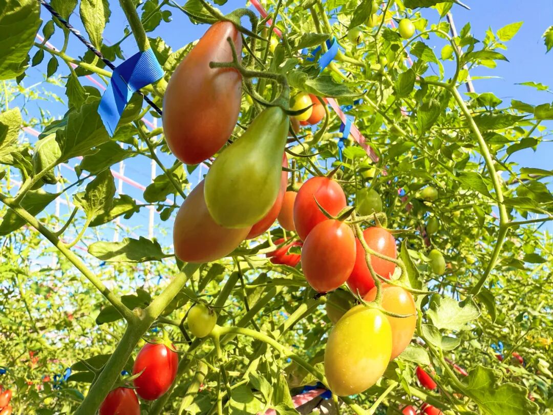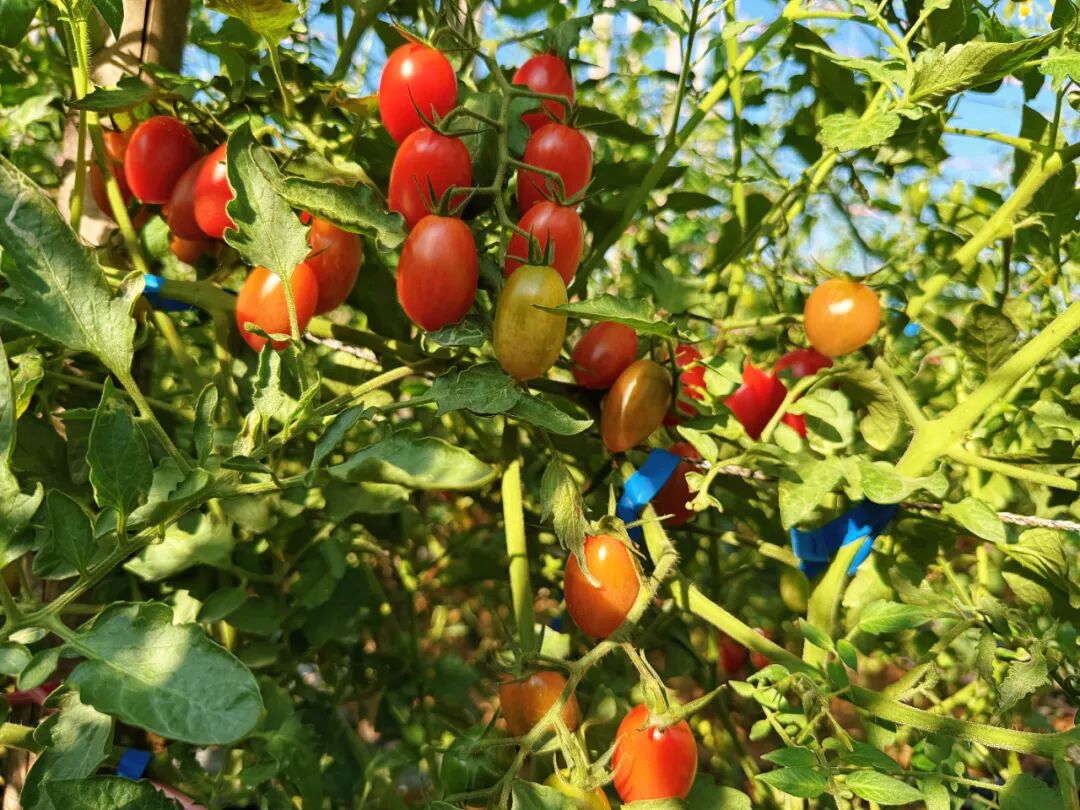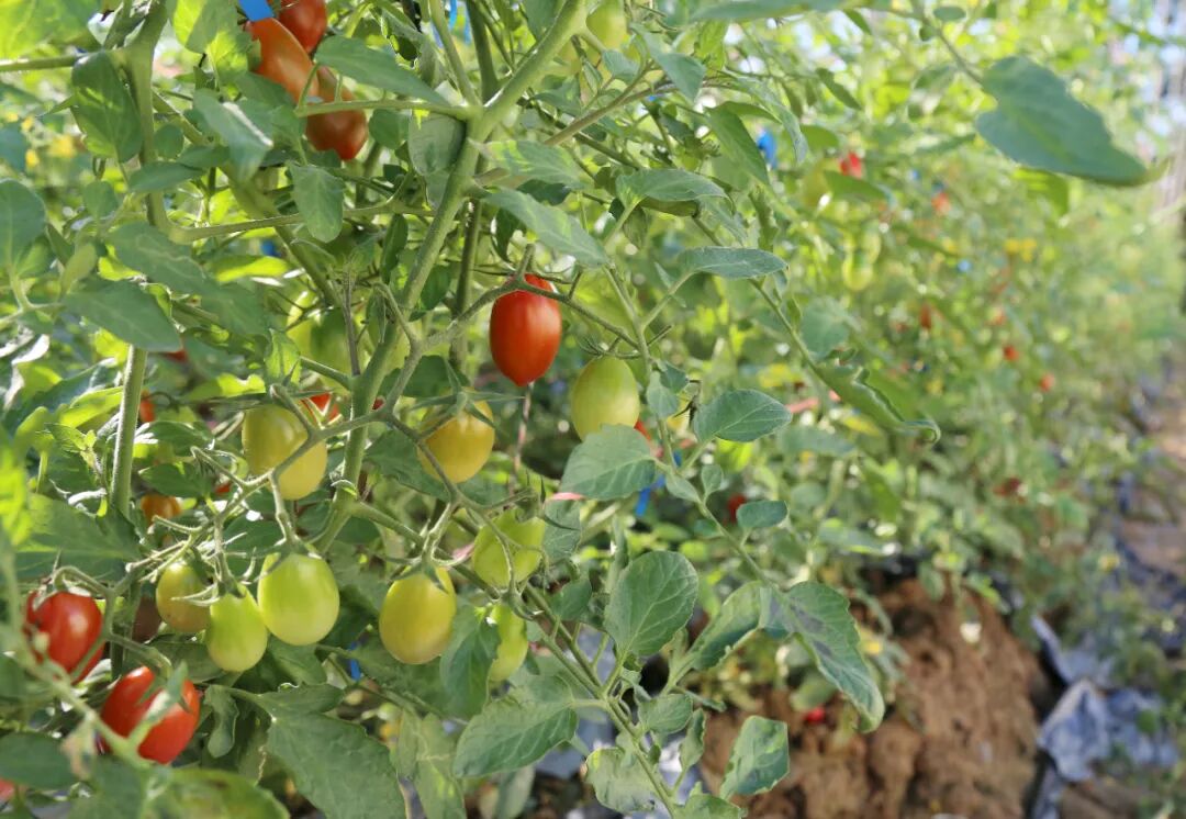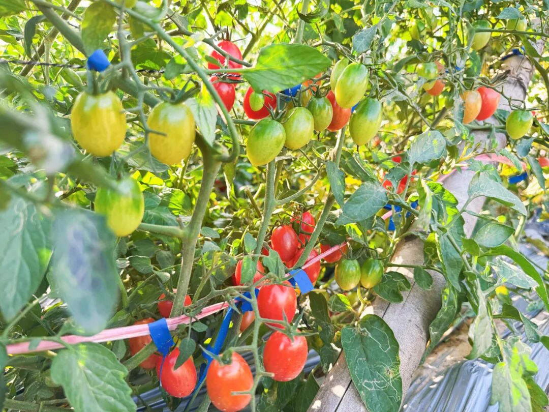 走进果园,空气中弥漫着淡淡的果香,爬满藤蔓的棚架一排挨着一排,片片绿叶间一串串形态均匀、色泽鲜亮、个头饱满的小番茄挂满了枝头,散发着诱人的光泽。青绿、嫩黄、橙红……鲜艳明亮的颜色十分讨喜。