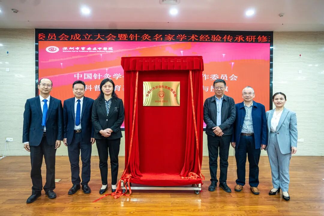 中国针灸学会会长、中国中医科学院首席研究员喻晓春教授,中国针灸学会副会长、广东省针灸学会符文彬教授,深圳市卫生健康委员会中医处处长赵曾艳,宝安区卫生健康局党组书记、局长幸思忠,宝安中医院(集团)党委书记、院长周鹏,针灸医院主任苏广为中国针灸学会科普教育基地(试点)揭牌。