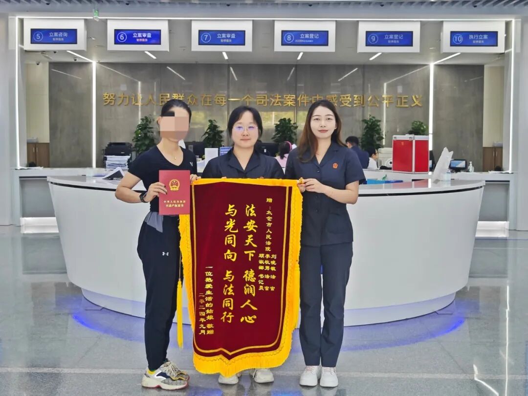 过户完成之后,小歌带着房产证和锦旗再次来到法院。在诉讼服务大厅,她向刘晓敏递上锦旗,锦旗上写着:“法安天下,德润人心,与光同向,与法同行。”