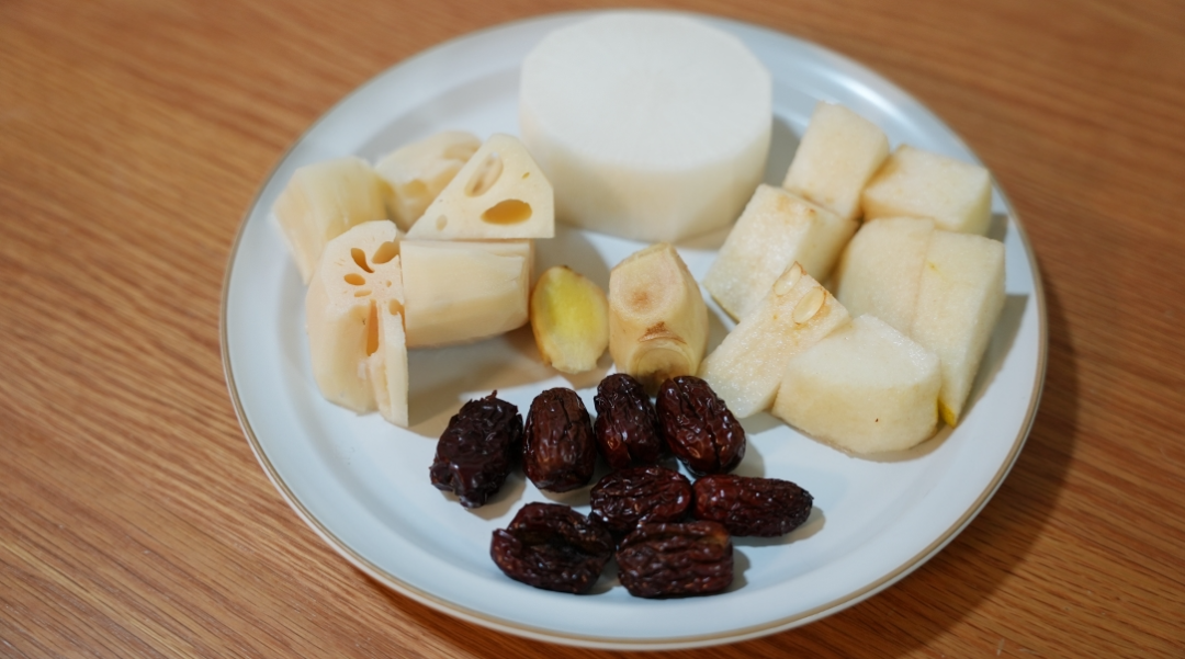材料:去皮生姜25克,红枣8颗去核,白萝卜500克,莲藕500克,雪梨2个