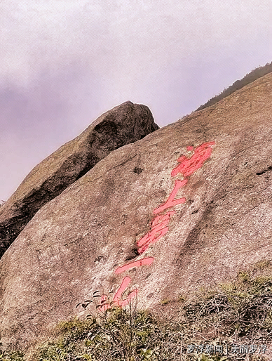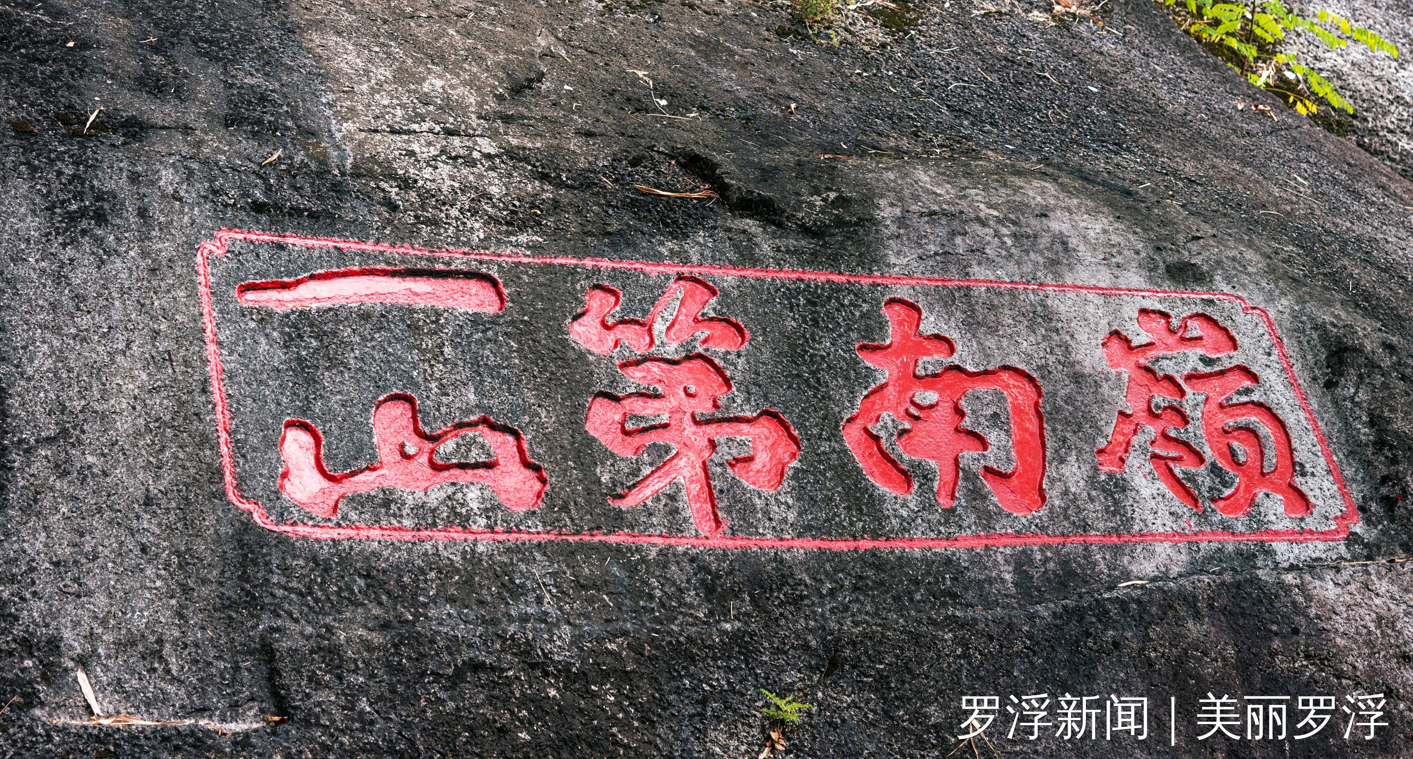 题刻“岭南第一山”奠定罗浮山近现代的江湖地位,是罗浮山最闪亮的名片。它位于华首台古钟楼尊胜阁下方、古雨花桥上方,由著名民国学者陈柱于1929年前后所刻。此题刻在罗浮山摩崖石刻中别具一格,采用了横书与竖书的混合写法。经著名书法家、古文字学家张桂光考证,“一山”竖写是合文的一种,具有整体性含义。