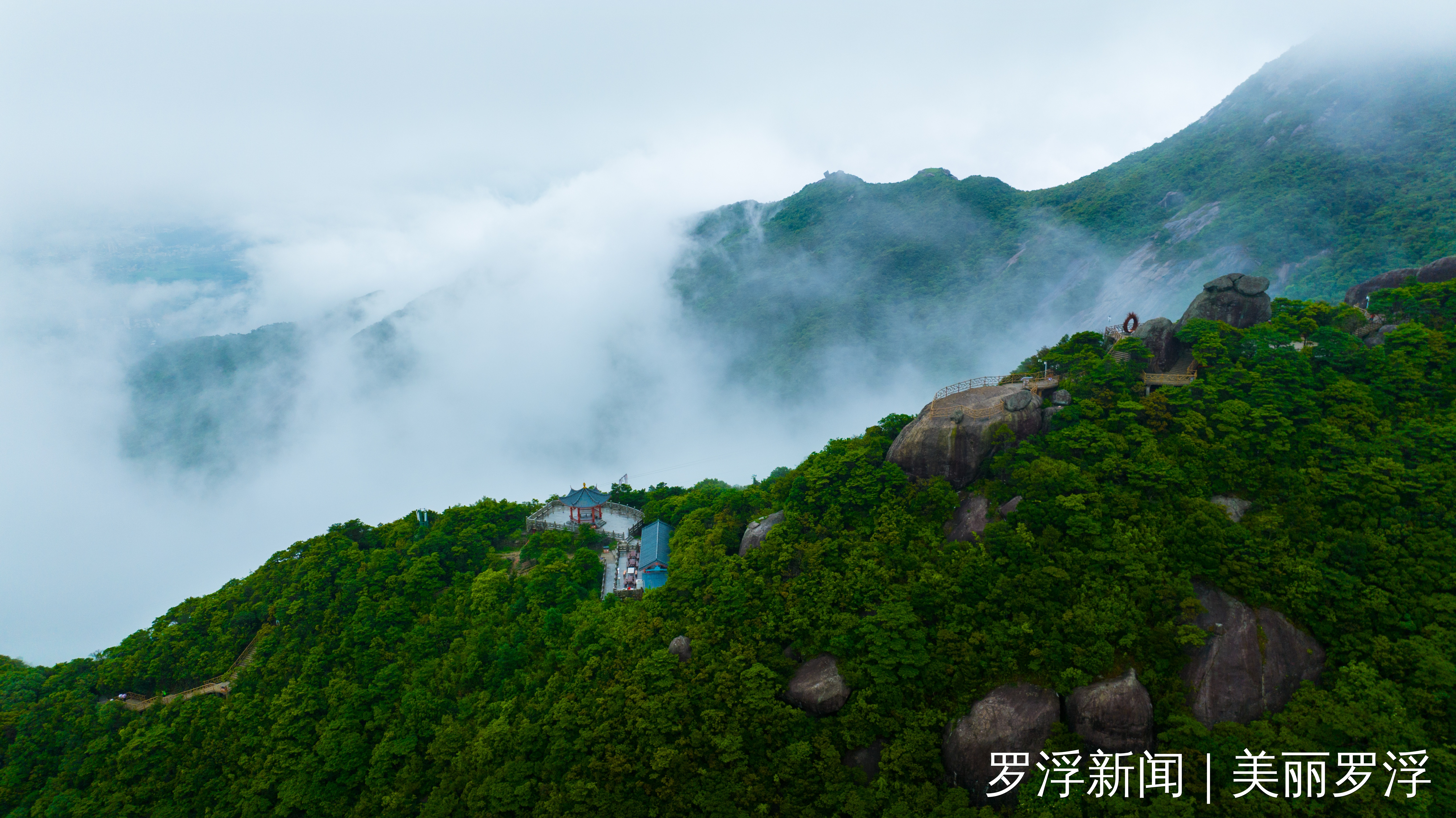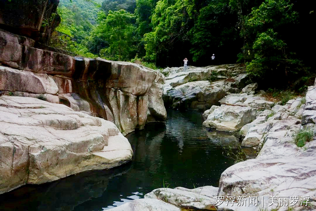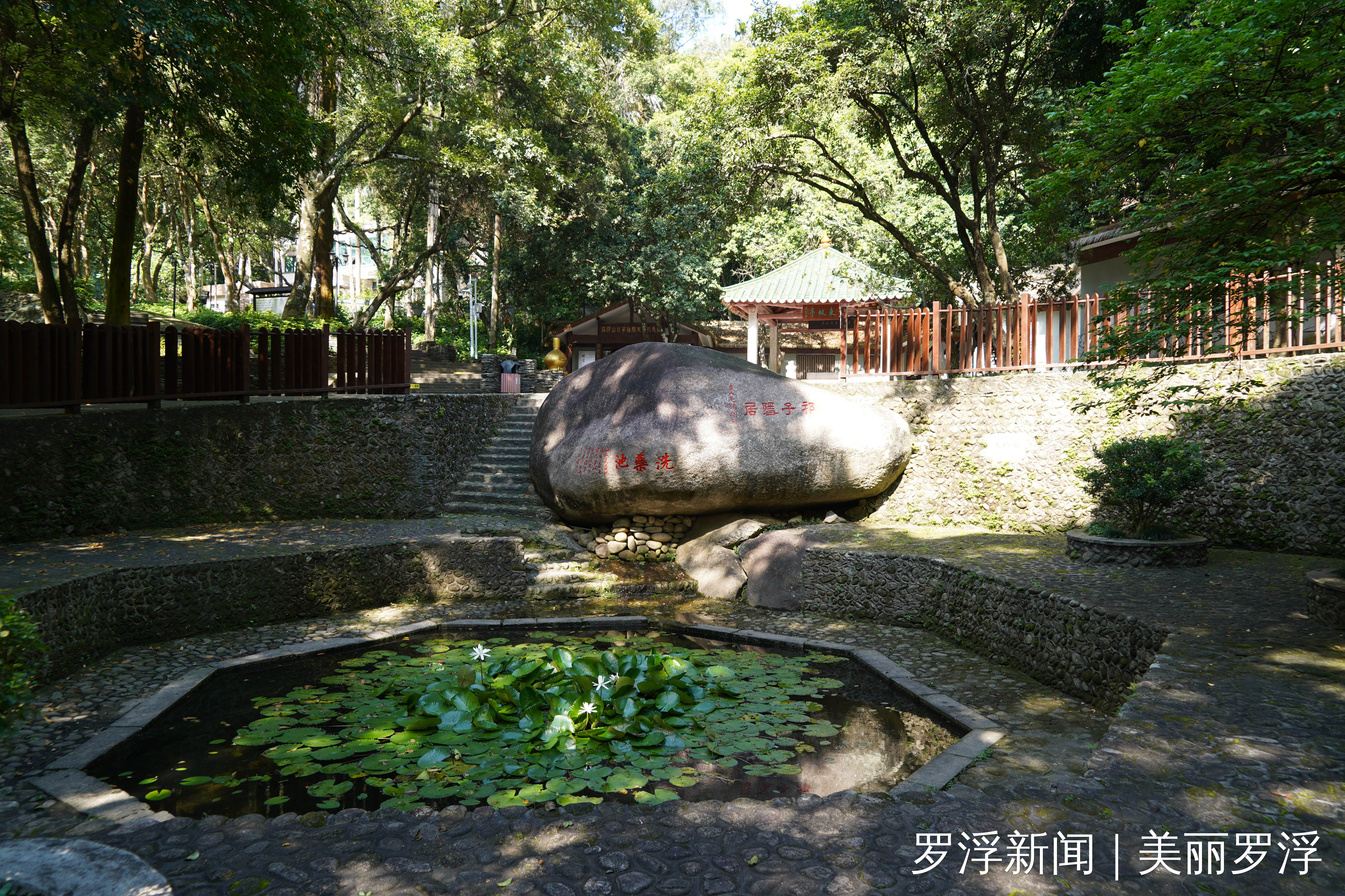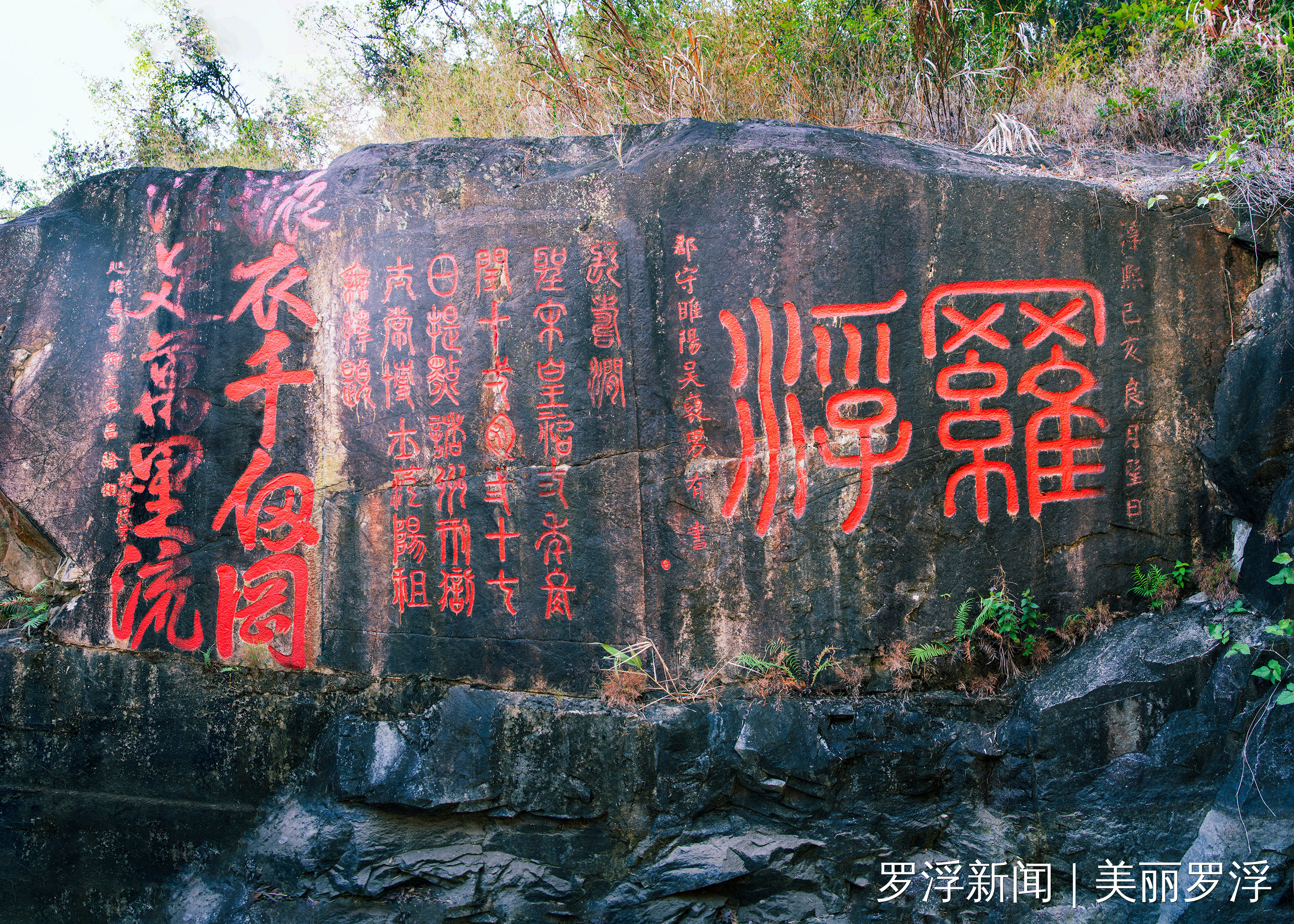 题刻“罗浮”与“长寿涧”位于同一石壁之上,字体巍峨,几乎与一人等高,堪称罗浮山摩崖石刻中字形规模最大者。“罗浮”刻于宋淳熙六年(1179),落款为“淳熙己亥朗月望日郡守雒阳吴褏男有书”。此石刻取篆书体势,笔致端严稳重,线条流畅雅致,古意盎然。历经近千年风霜雨雪,仍不失为罗浮山摩崖石刻的卓越典范。据《罗浮山摩崖石刻》记载,“罗山万仞云中起,浮岛一峰天外来。”自司马迁、班固载诸史而道家之书指为洞天福地。于是五岭之交,言山者必首推罗浮。