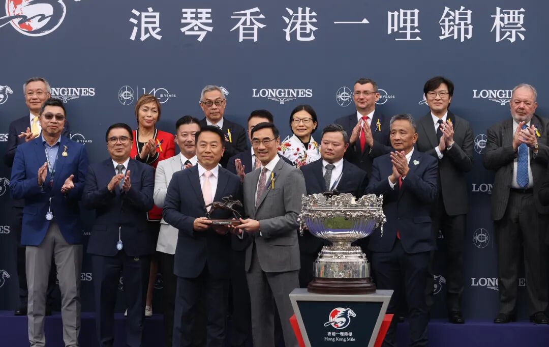 香港赛马会主席利子厚颁发浪琴香港一哩锦标奖杯及骑师骏马铜像予“遨游气泡”的练马师姚本辉(一排、左)