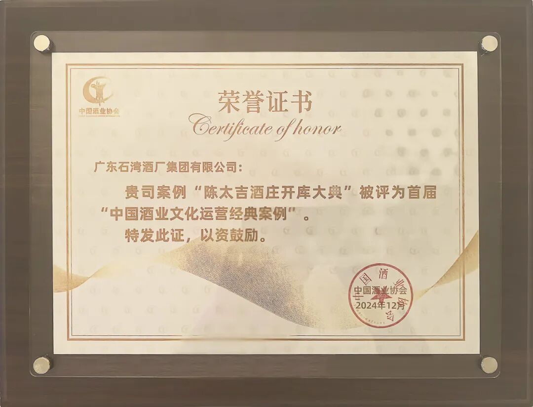 广东石湾酒厂集团(陈太吉酒庄)“陈太吉酒庄开库大典”文化 IP 入选首届“中国酒业文化运营经典案例”,同时,集团党委书记周文燕入选首届“中国酒业新文化建设创新人才”。体现了中国酒业对石湾酒厂集团在推动酒业新文化建设中作出的卓越贡献和创新精神表示高度肯定。