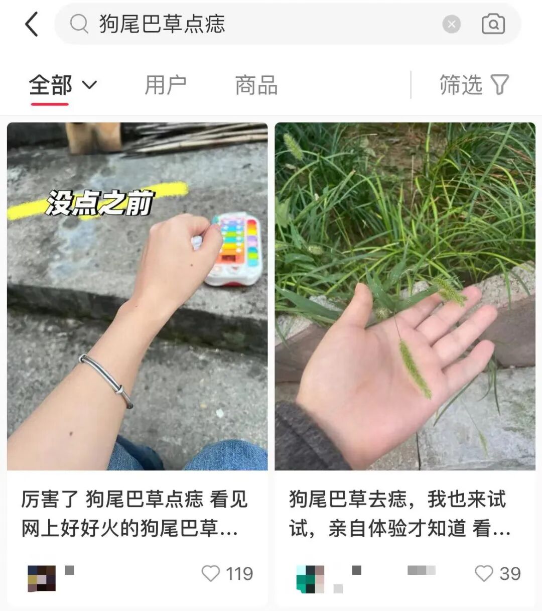 通过对多个短视频进行观察研究后医生发现网友所谓的狗尾巴草点痣不是单纯靠狗尾巴草汁液含有腐蚀性性物质,这一说法尚缺乏科学依据。而是利用狗尾巴草茎反复对皮肤的黑痣进行戳刺,将黑色素痣的痣细胞戳刮去除,靠的主要是物理作用,这只限于较表浅的痣。就算不用狗尾巴草,只要你劲到了地方戳对了,这个痣也是说点就点,安全与否就另说了。