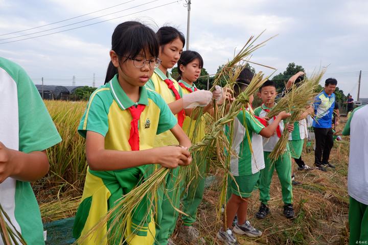 活动当天,全校师生浩浩荡荡地走进学校附近的稻田,以通关“打卡”的方式展开了一系列精彩纷呈的活动。在此之前,学生们已经在课堂上通过“认识水稻”的课程,了解了水稻的生长习性以及袁隆平等农业先辈的卓越贡献。一首首描写粮食的古诗更是激发了孩子们对稻谷的深厚情感。