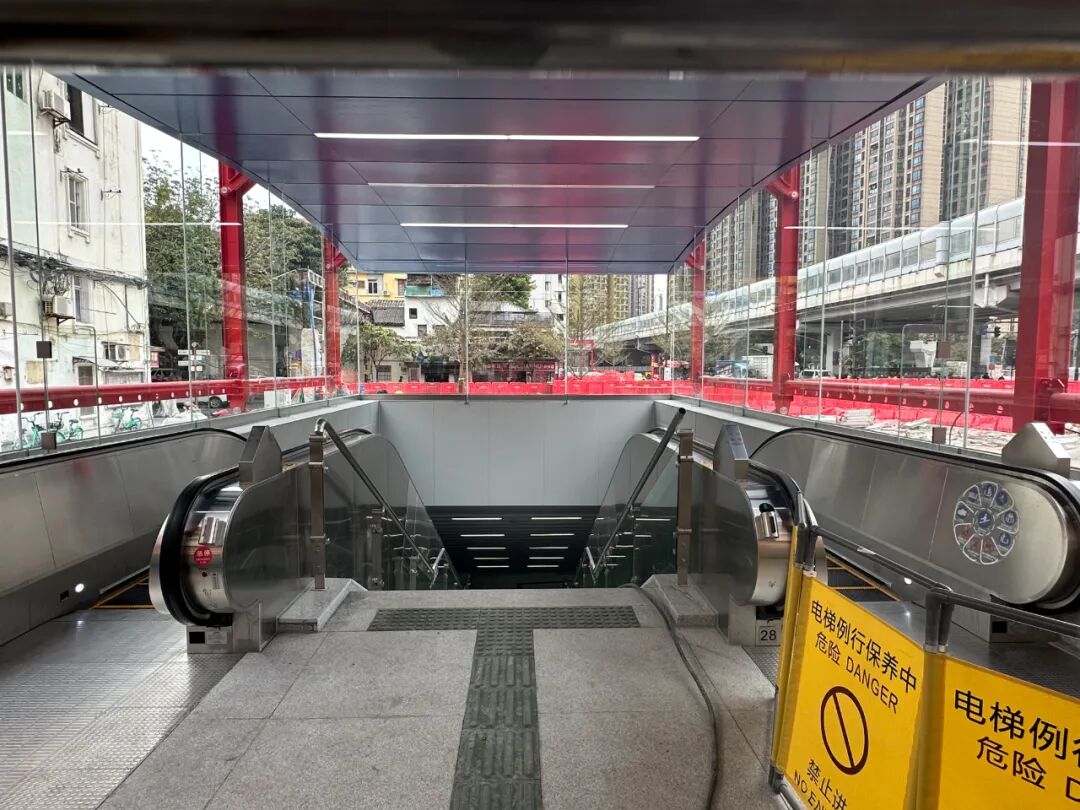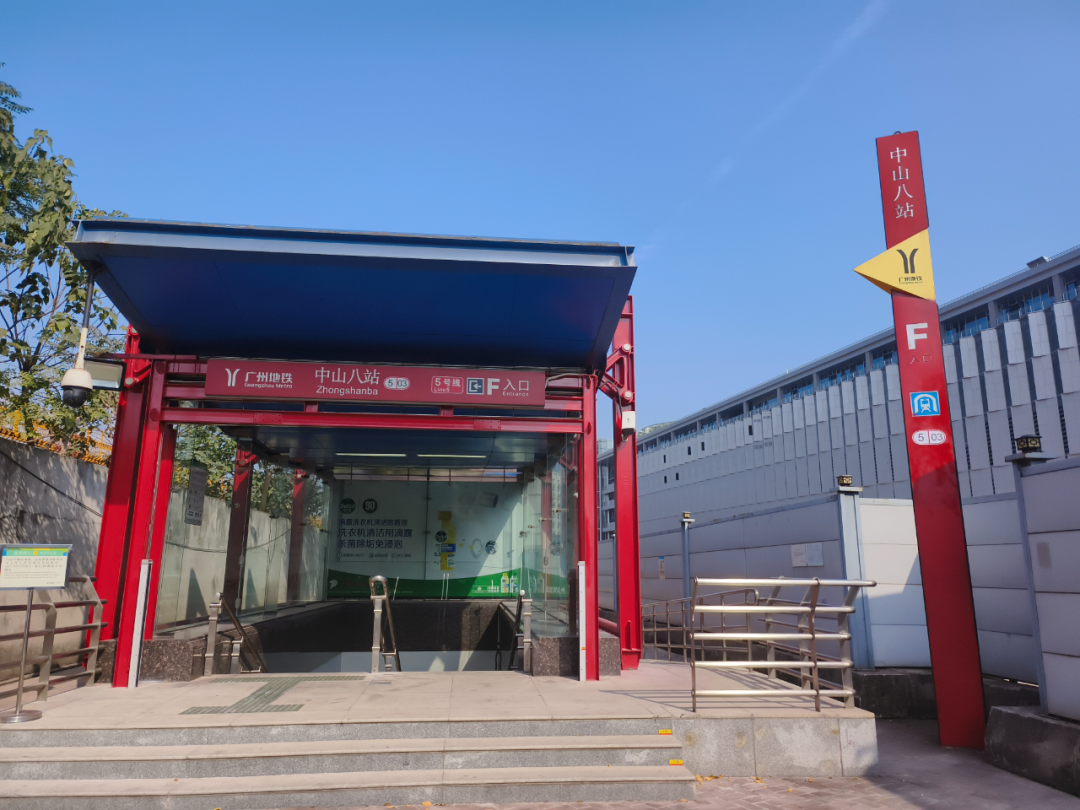 小荔走访当天看到,站厅内部分区域仍在围蔽施工,站点目前启用的出入口主要是A口、D口和F口,A口位于中山路南侧,靠近荔湖大厦、荔湾湖公园、泮塘村、黄沙大道等地;D口和F口位于道路北侧,靠近中山八路公交总站。尚未开放的E口位于在建的中山八路交通换乘枢纽,目前也在围蔽施工,从远处能看到地铁红色的导向柱。