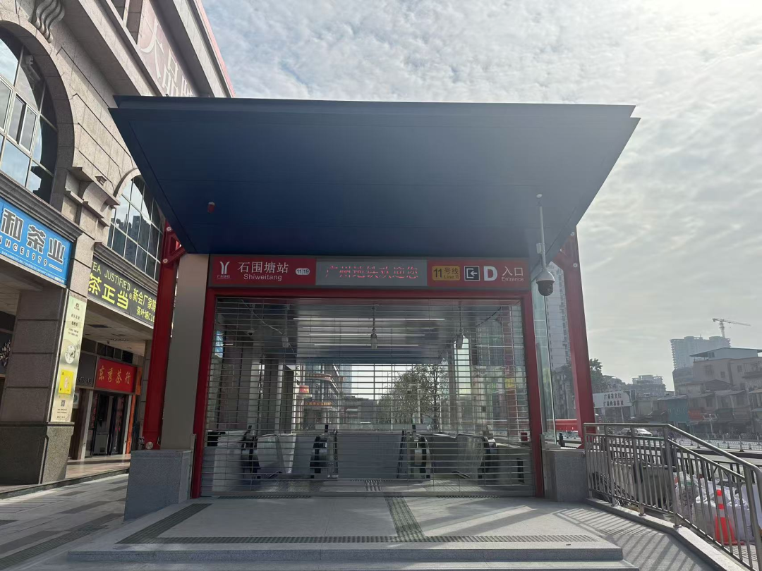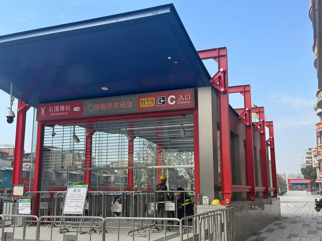 石围塘站位于广州市荔湾区芳村大道中架空路南侧,小荔走访看到,当前,地铁十一号线石围塘站C、D出口周边围挡已经全部拆除,路面也全部翻新。出口处虽有栏杆围挡,但能听到站内正在试播报站提醒广播。