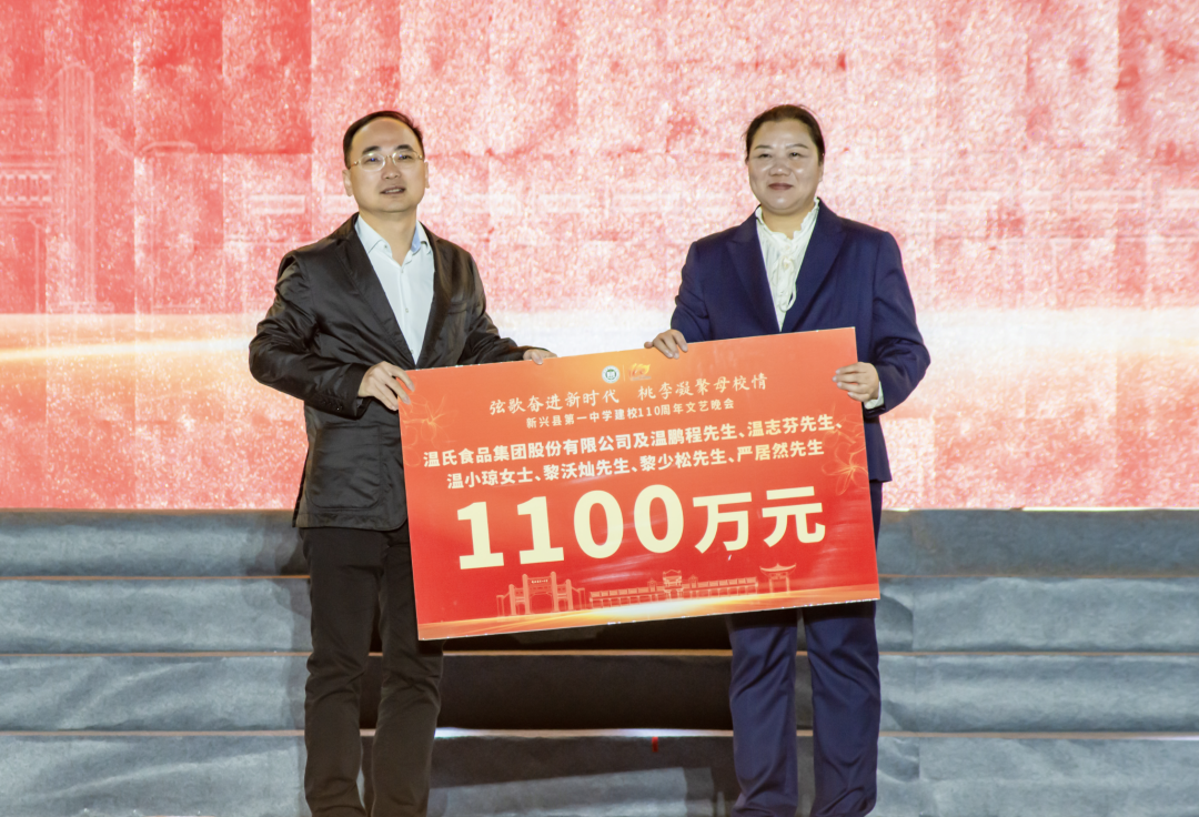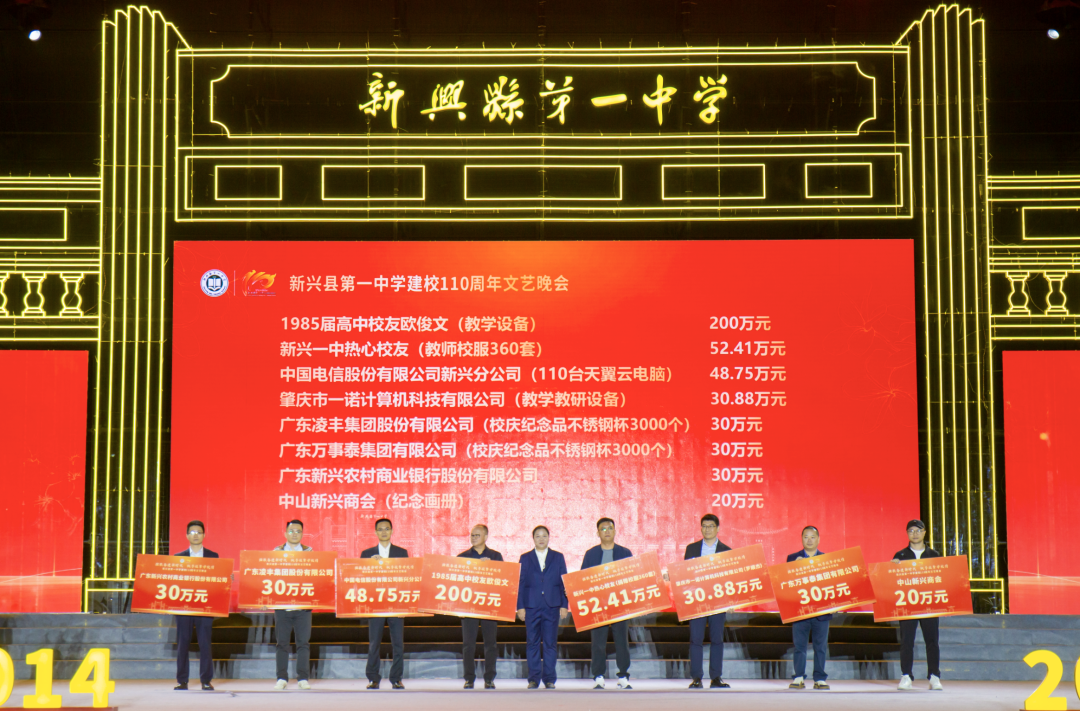 在新兴一中建校110周年之际,广大校友、热心企业和社会各界人士纷纷捐款捐物,表达对新兴一中的深情关爱和鼎力支持。在晚会上,以温氏集团为代表的39位爱心企业代表、热心校友、商会以及社会各界人士上台捐赠,新兴县第一中学校长陆晓云代表学校接受捐赠,并回赠纪念品。每一笔捐赠,都凝聚着大家对学校的深情厚谊,都是对学校莫大的鼓励与扶持。这些爱心将化作推动学校发展的不竭动力,助力一中培养更多优秀人才,回馈社会。