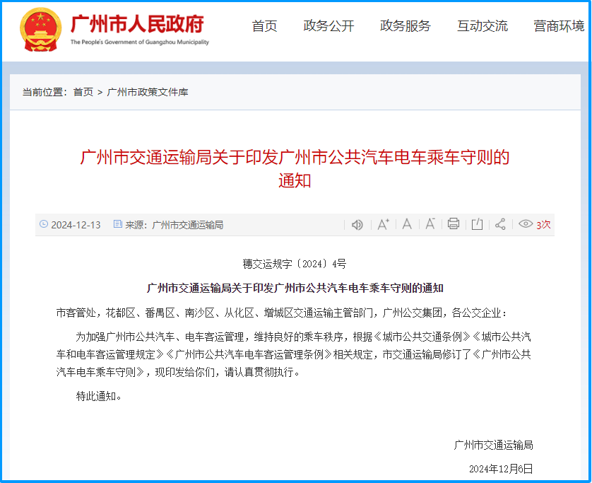记者获悉,为加强广州市公共汽车、电车客运管理,维持良好的乘车秩序,根据相关规定,市交通运输局修订了《广州市公共汽车电车乘车守则》(以下简称《乘车守则》),该守则自2024年12月23日起施行,有效期5年。