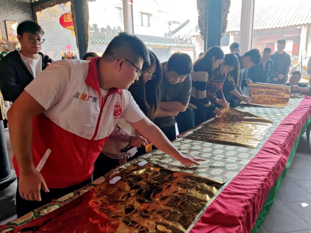 “恒美坊的金龙全长150米,由39个‘猪仔笼’串连而成,外披颜色鲜艳的龙被,要200多人才能把它舞动。‘三江龙乡游龙’源于清代嘉庆年间,2009年被列为江门市级非物质文化遗产代表性项目。每逢春节、元宵节等重大节日,三江镇联和村、新江村都有舞龙的传统。游龙所到之处,村民纷纷摸龙头、拍龙尾、穿龙身,祈求风调雨顺、国泰民安。三江游龙最好看的是龙打圈,俗称‘打龙兜’,又称‘打龙饼’。由舞龙珠者引龙从右方运成一个大圆圈,然后缓缓从外到里,一层层地打圈,龙头卷入中央,被龙身裹成团,金龙昂首摇摆,十分威风。”随着文化文艺志愿者的讲解,金龙的全貌和游龙活动的盛景逐渐展现在大家的眼前。