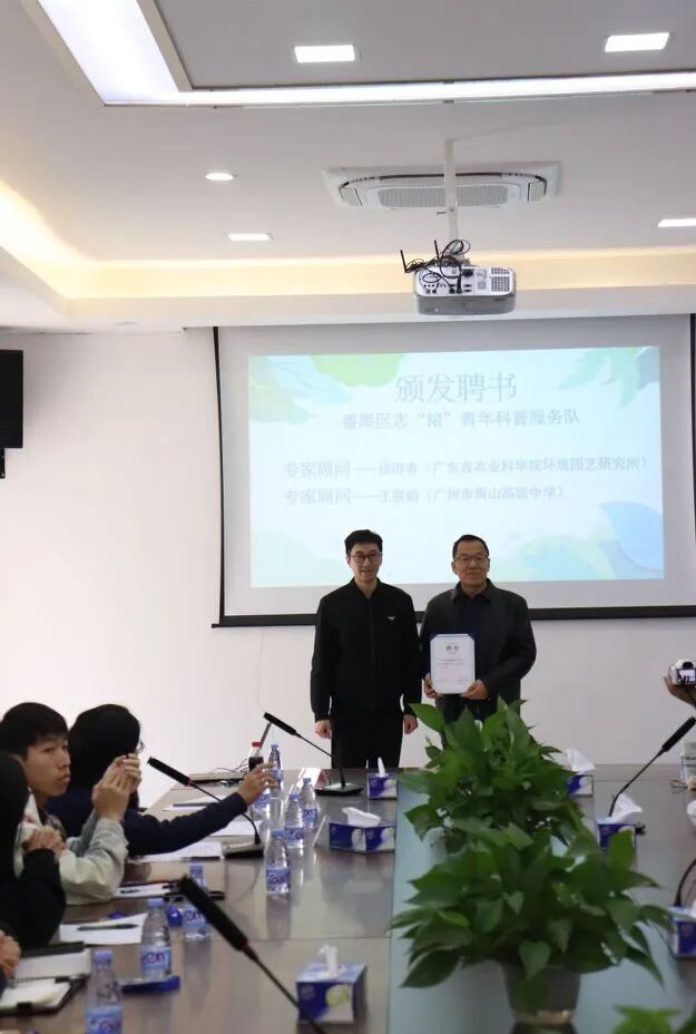 活动上,共青团番禺区委员会为广东省农业科学院环境园艺研究所研究员徐晔春和广州市禺山高级中学教研处主任王联新颁发植物科普专家顾问聘书,其他主办单位向植物科普志愿者领队颁发聘书,标志着他们正式加入植物科普志愿服务行列。