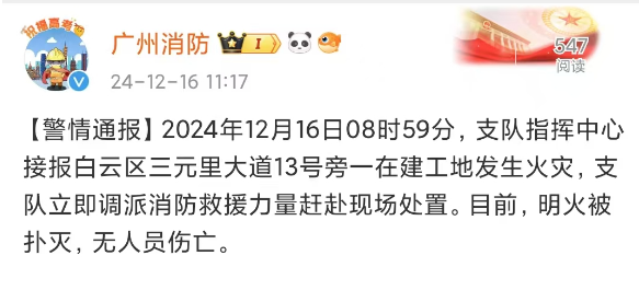 据@广州消防官方微博通报:2024年12月16日08时59分,支队指挥中心接报白云区三元里大道13号旁一在建工地发生火灾,支队立即调派消防救援力量赶赴现场处置。目前,明火被扑灭,无人员伤亡。