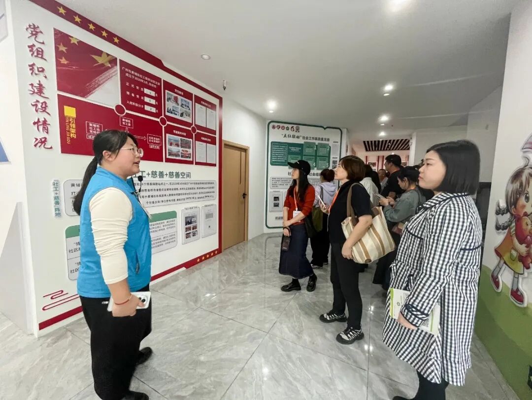 社工站主任曾思敏按照参观路线向来访代表实地介绍了社工站的整体运营情况,重点展示了“五社同心”服务品牌以及“一老一小”关爱服务项目。同时,结合实际案例,阐述了社工站如何通过整合社区资源、联动多方力量,为社区居民提供专业、多元的社会服务,有效回应居民需求,提升社区治理水平。