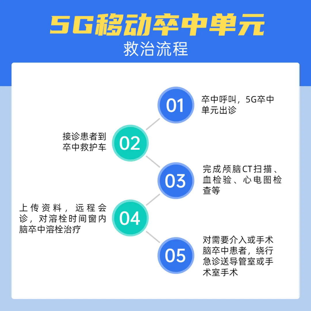 5G移动卒中单元是一种集5G移动信息系统、移动CT、卒中诊断、远程会诊、急救等功能为一体的智能化救护车。它将小型移动CT和相关的检验设备装配在专用救护车上,通过5G网络实现与医院系统的实时数据共享和远程会诊功能。具体来说,5G移动卒中单元能够在救护车上进行CT扫描、生化分析等检查,并将患者的生命体征、医学影像等数据实时回传到医院,使医院能够提前准备并提供远程指导。