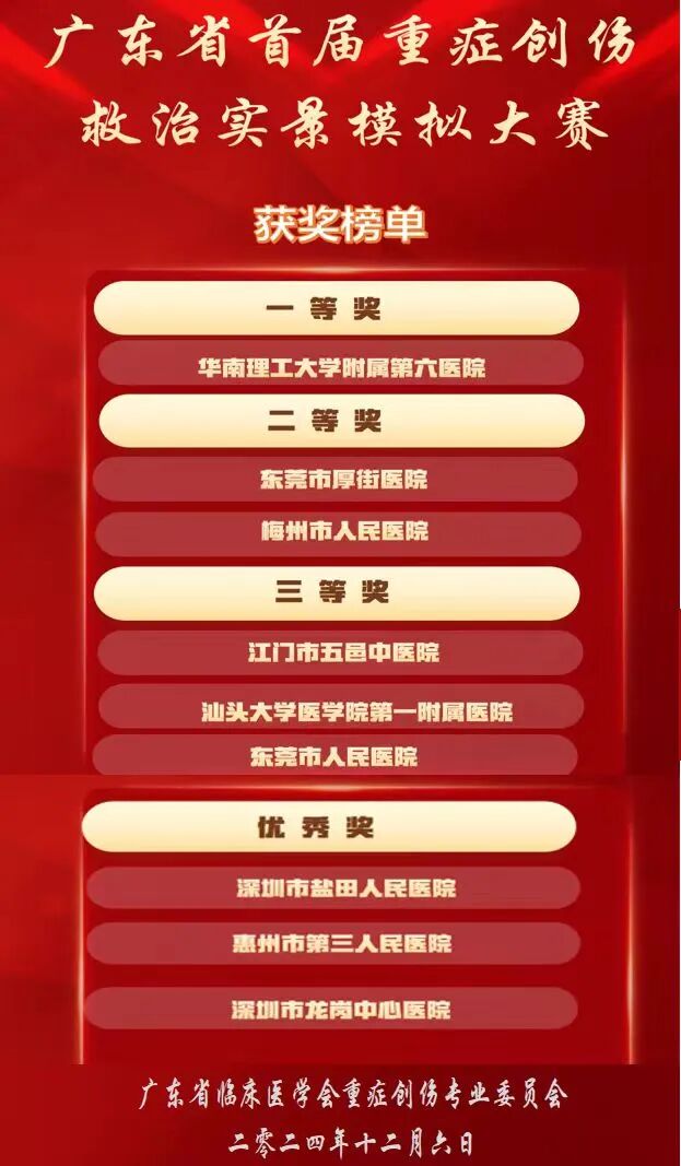 为了进一步加强学术交流,提高创伤与急危重症医学专业人员的学术水平,由广东省临床医学学会重症创伤专业委员会、广东省医院协会、中华创伤骨科杂志联合举办的广东省首届重症创伤救治实景模拟大赛于12月6-7日在深圳南山举行。