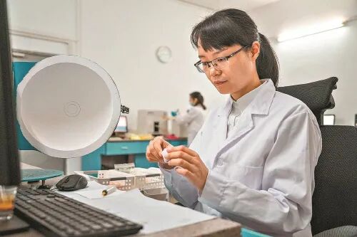 丁雪梅(右)与同事一起做LED荧光粉的杂质测试和分析。
