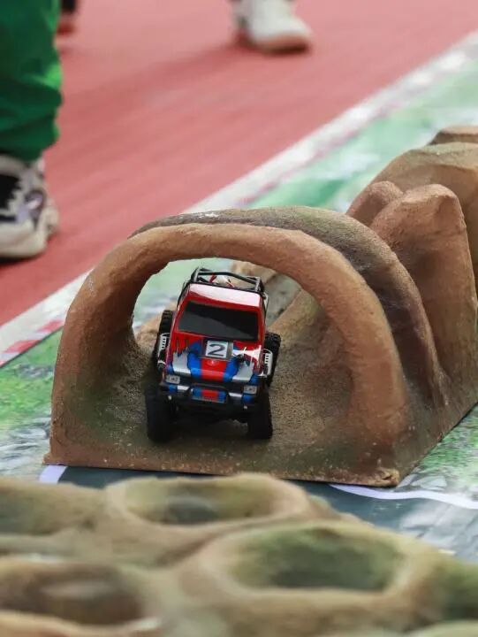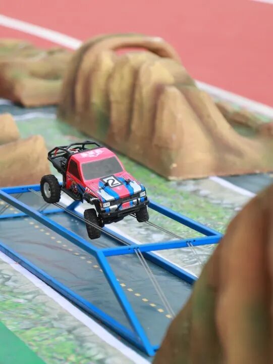 1/24电动攀爬车积分赛的现场战况尤为激烈,极其考验选手的操控能力和稳定的心理素质。选手需要操控车辆模型通过爬陡坡、下斜坡、爬绳索、绕炮弹坑、爬岩石等障碍,并精准倒车入库才能顺利完赛。