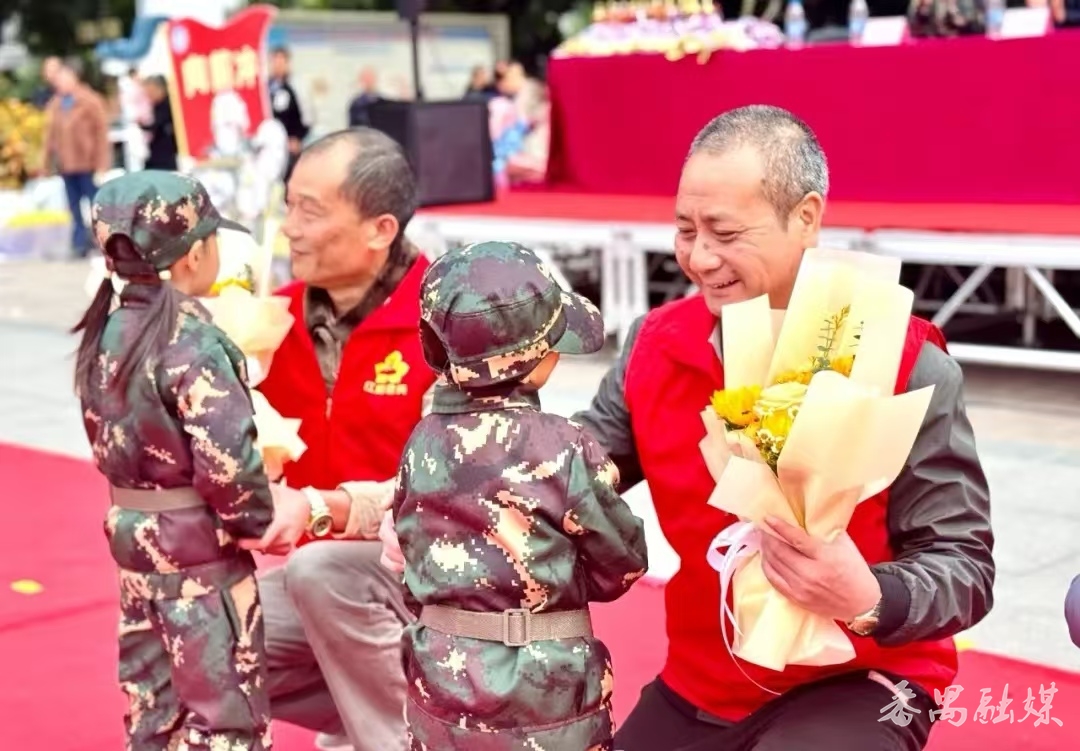 此外,户外场景游戏作为幼儿园的特色课程之一,此次也巧妙地融入了国防教育元素,并引入了武术活动。一出《旗开得胜》的场景展示,将现场气氛推至了高潮。中班幼儿带来的《海军旗语操》别具一格,小班的萌娃们和爸爸妈妈手牵手,一起进行温馨的手语操展示。值得一提的是,为了向退役老兵们致以崇高的敬意,幼儿园特邀沙湾街红棉老兵何兆源、何锦华及欧阳日成来到现场,幼儿代表们为老兵们送上鲜花与温暖的拥抱,传承着对英雄的敬仰与爱戴。
