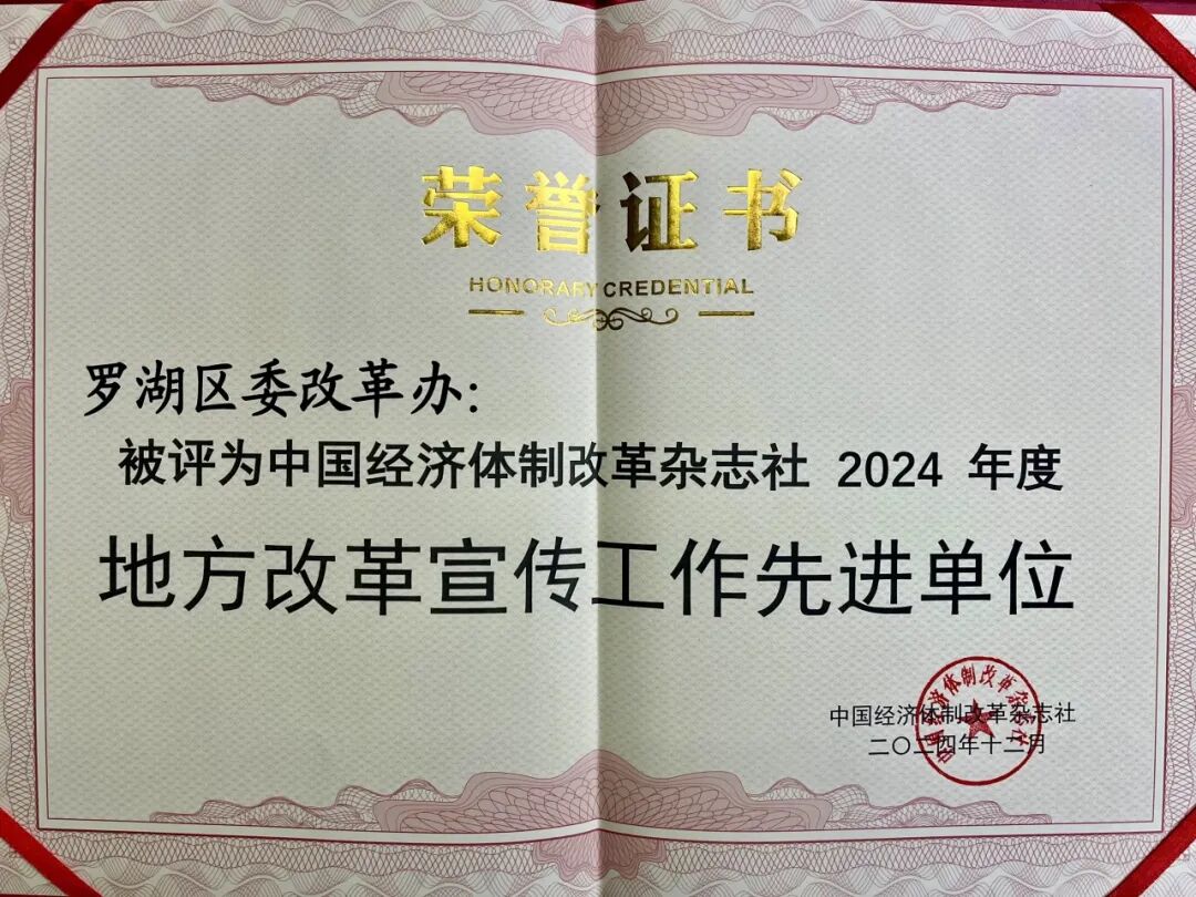 此外,罗湖区委改革办被评为中国经济体制改革杂志社2024年度地方改革宣传工作先进单位。