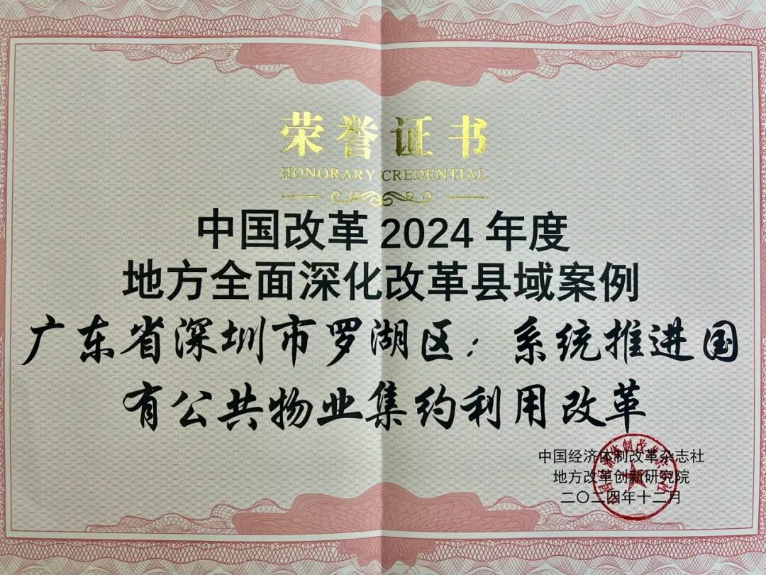 近日,“中国改革2024年度地方全面深化改革典型案例”名单公布:罗湖区报送的“系统推进国有公共物业集约利用改革”典型案例入选中国改革2024年度百佳案例(连续四年、全市各区唯一),同时荣获2024年全国县域改革优秀案例(全国仅30个,为全省唯三的获奖单位)。