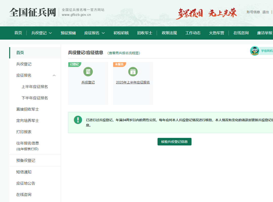 如已进行兵役登记,点击“继续进行本年度参军报名”完善个人信息。按照网页指示,完善并核实信息,网上应征报名就完成了。