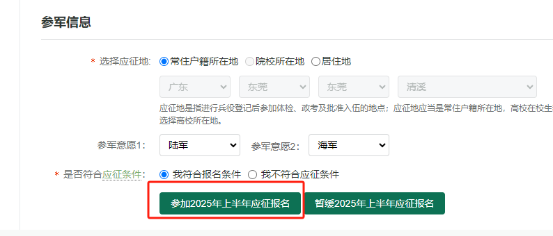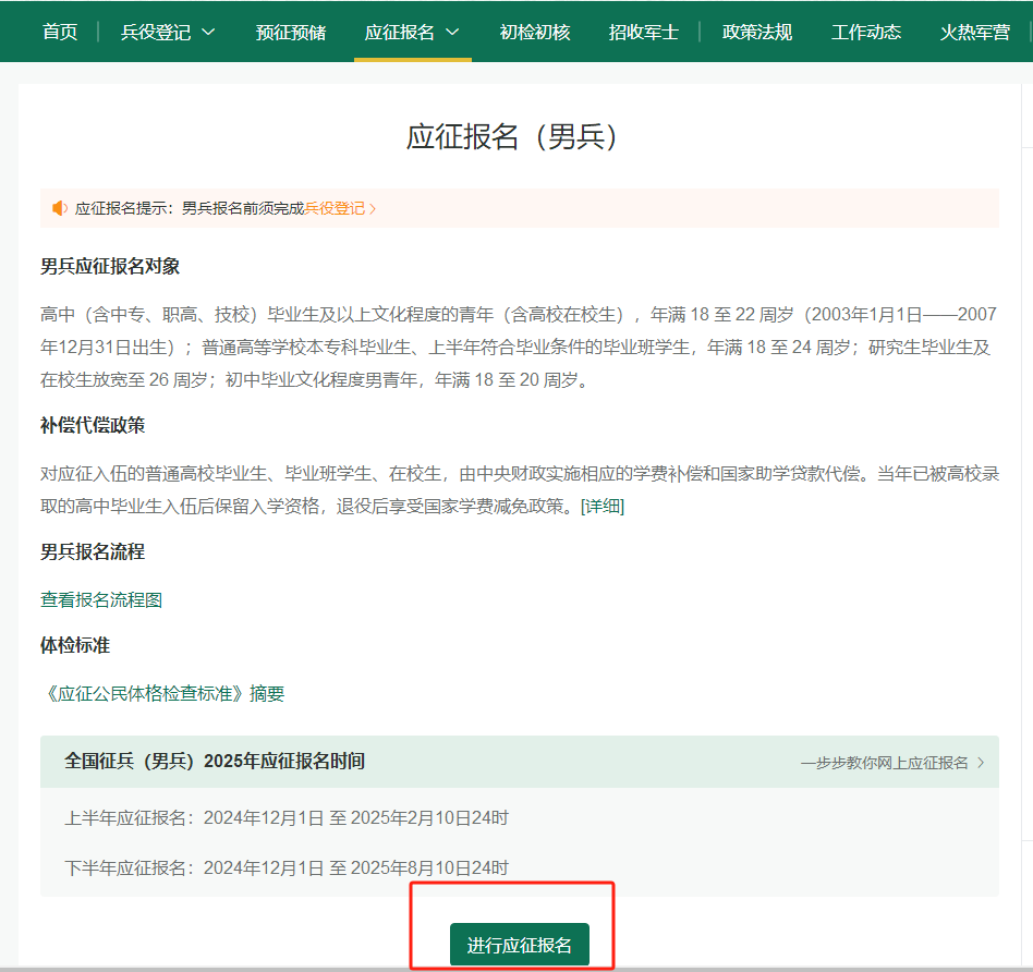 点击“应征报名(男兵)”后,出现的页面会告知报名时间以及参军政策说明,建议大家认真阅读后,随后点击“进行应征报名”。