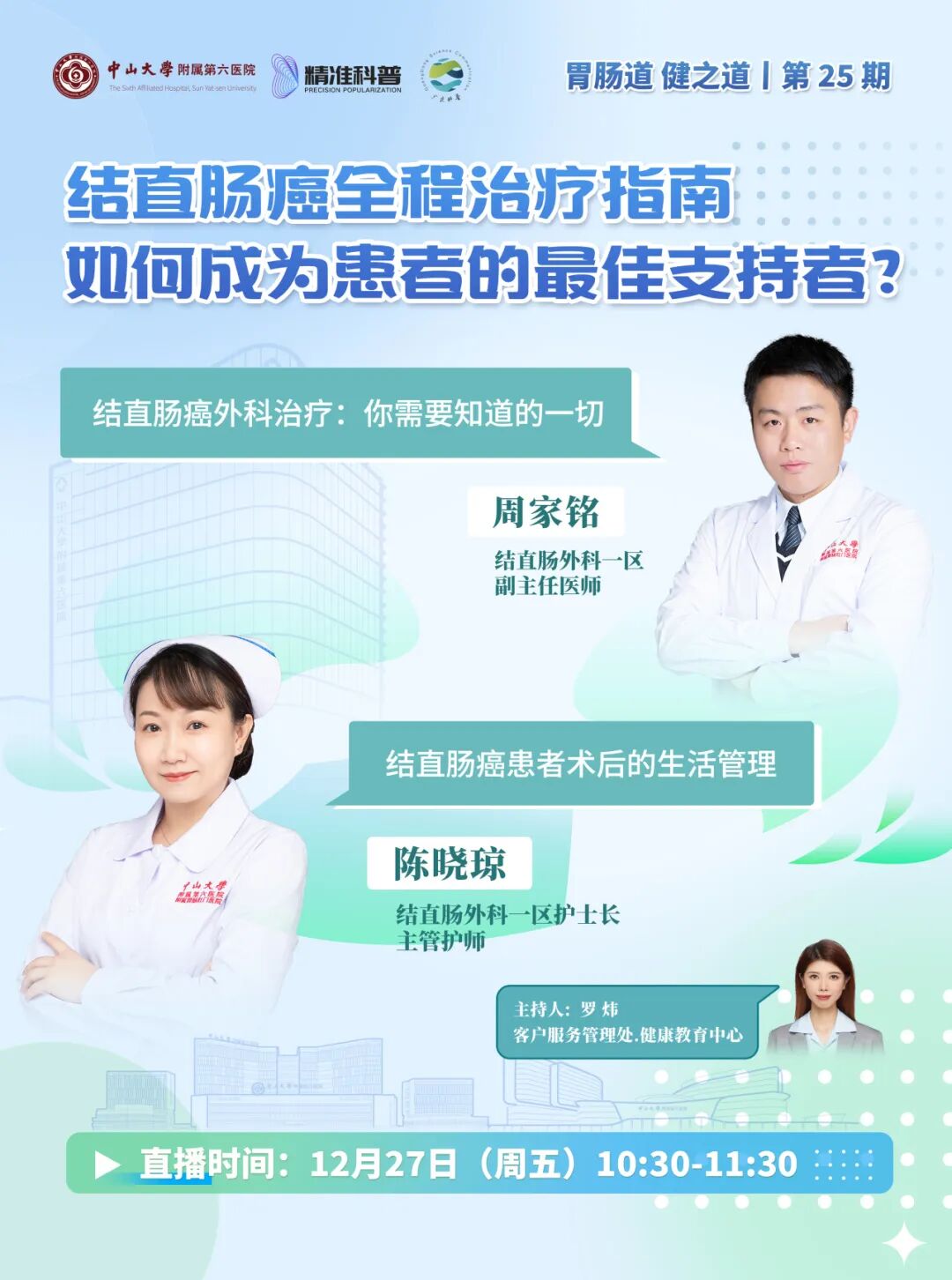 为普及结直肠癌相关知识,我院携手广东省精准医学应用学会,12月27日10:30 -11:30开展《胃肠道 健之道》直播专栏第25期“结直肠癌全程治疗指南——如何成为患者的最佳支持者?”专题科普直播。由我院结直肠外科一区周家铭副主任医师及护士长陈晓琼主管护师围绕“结直肠癌外科治疗:您需要知道的一切”和“结直肠癌患者术后生活管理”两大主题,为观众深入解析结直肠癌治疗及术后管理要点,助力患者克服难关。