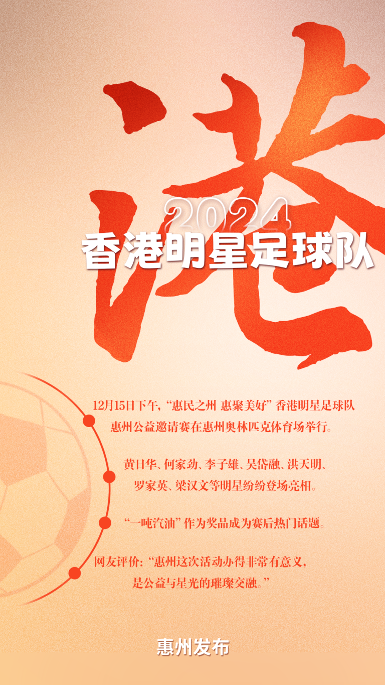 2024年12月15日下午,“惠民之州 惠聚美好”香港明星足球队惠州公益邀请赛在惠州奥林匹克体育场举行。黄日华、何家劲、李子雄、吴岱融、洪天明、罗家英、梁汉文等明星纷纷登场亮相,一张张熟悉的面孔为现场球迷带来了一场“回忆杀”。香港明星足球队与惠州本地选拔球员组成的“惠聚美好”足球队同场竞技,为现场2万多名球迷献上了一场精彩纷呈的赛事。