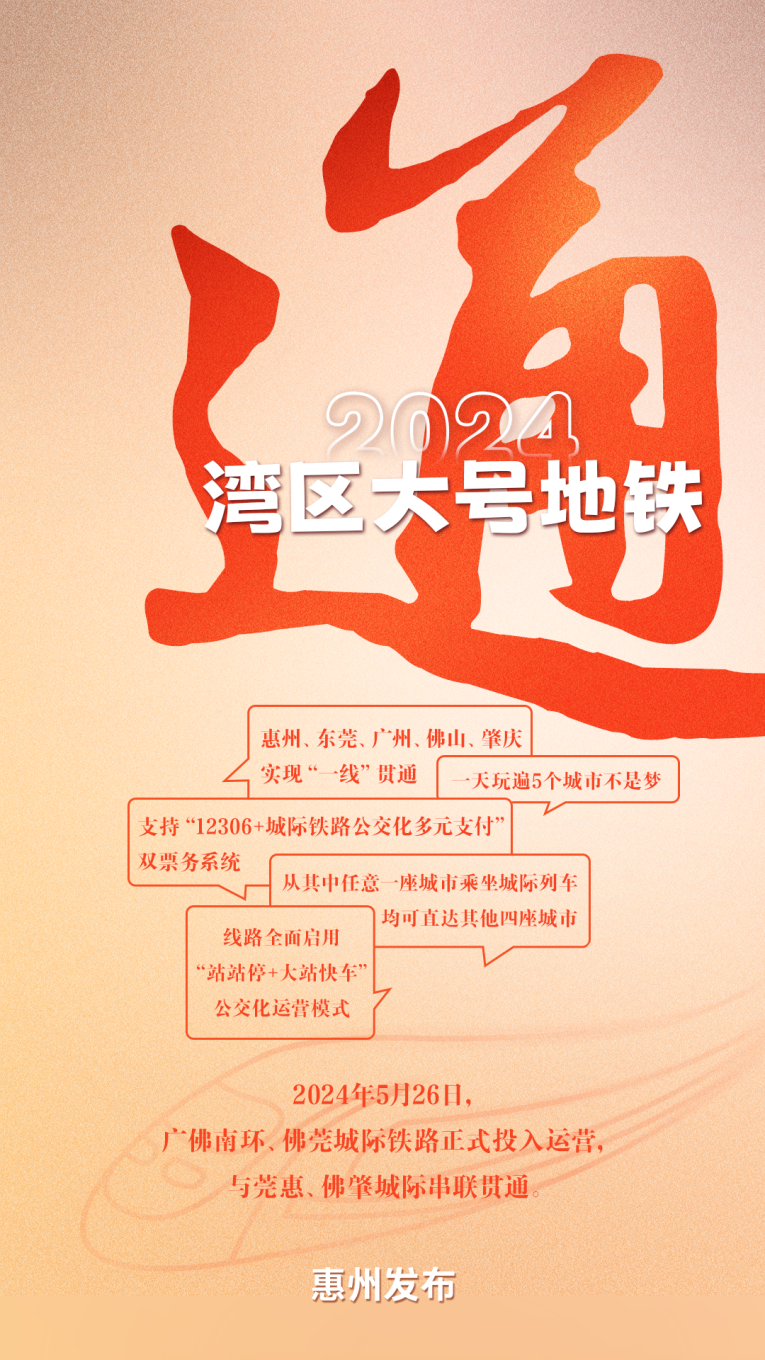 2024年5月26日,广佛南环、佛莞城际铁路正式投入运营,与莞惠、佛肇城际串联贯通。四条城际铁路组成了一条长258公里、最高时速达200公里的大湾区交通主通道。惠州、东莞、广州、佛山、肇庆实现“一线”贯通,从其中任意一座城市乘坐城际列车,均可直达其他四座城市,且时间间隔更短、直达列车更多。线路全面启用“站站停+大站快车”公交化运营模式,旅客搭乘城际铁路与地铁一样便捷,随买随进、随到随走。