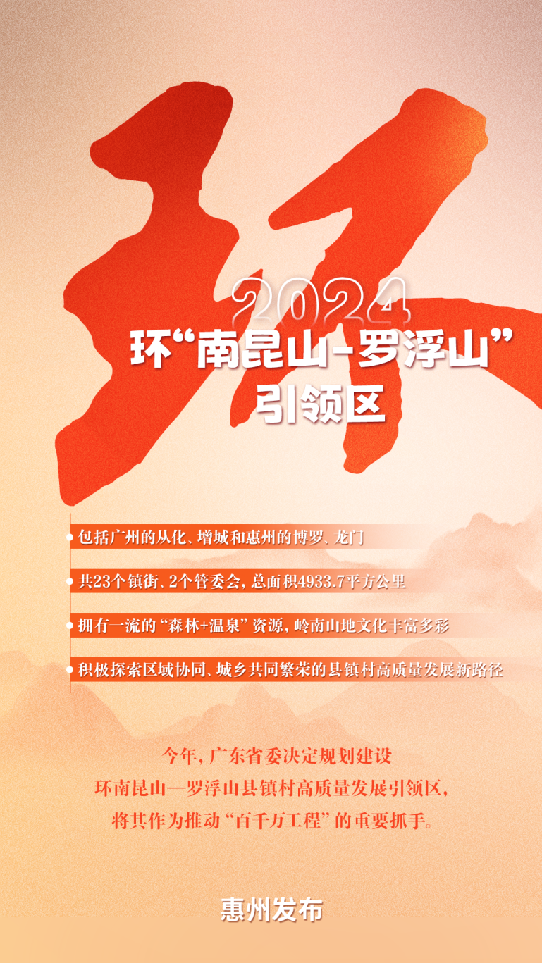 今年,广东省委决定规划建设环南昆山—罗浮山县镇村高质量发展引领区,将其作为推动“百千万工程”的重要抓手。该片区将打造成为粤港澳大湾区生态花园、世界级森林温泉康养目的地、岭南特色县镇村现代化建设样板、城乡融合发展先行地。截至2024年12月,惠州高标准建设218公里最美旅游公路,引领区在建项目161宗,总投资342.64亿元,新签约项目102个,总投资约600亿元。