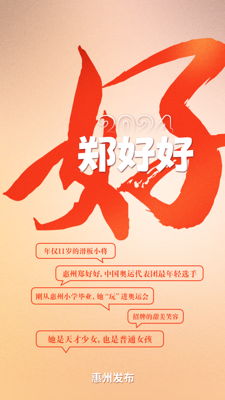 郑好好,2012年8月11日出生,2019年加入惠州滑板队,2021年9月,以全运史上最小年龄参赛选手的身份,获得第14名。随后,她多次代表广东省滑板队夺得全国赛事女子碗池项目的冠军。2024年8月6日,郑好好登上巴黎奥运会女子碗池的赛场。经过三轮比赛,她最终位列预赛第18名,遗憾止步,无缘决赛。近日,人民日报盘点2024中国体育热词,被网友称为“小孩姐”的郑好好入选。