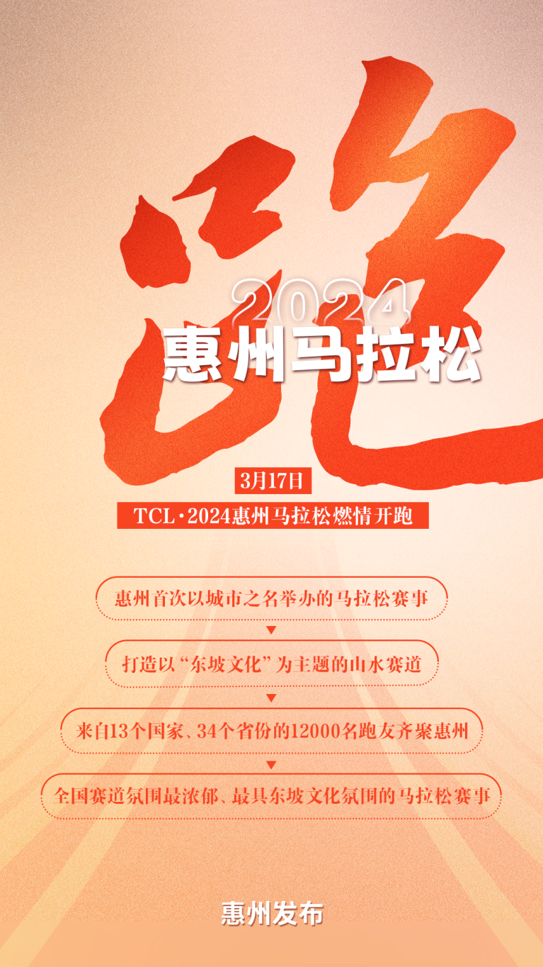 2024年3月17日,TCL·2024惠州马拉松燃情开跑,来自13个国家、34个省份的12000名跑友齐聚惠州,用脚步丈量这座文化之城。本届“惠马”打造以“东坡文化”为主题的山水赛道,让广大参赛选手在古今结合的赛道上畅跑马拉松,同时追寻东坡足迹,感受东坡“竹杖芒鞋轻胜马”的洒脱和“不辞长作岭南人”的惬意。