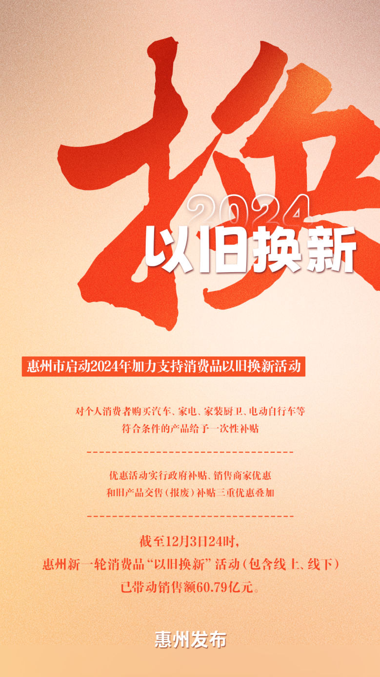 紧跟国家、省步伐,惠州于5月至8月组织开展2024年惠州市消费品“以旧换新”消费券发放活动,包括家用电器“以旧换新”活动和汽车“置换更新”活动。9月起,惠州又启动新一轮家电、汽车以旧换新促消费活动,补贴力度空前,市场反响强烈,进一步掀起了消费热潮。截至12月3日24时,惠州新一轮消费品“以旧换新”活动(包含线上、线下)已带动销售额60.79亿元。