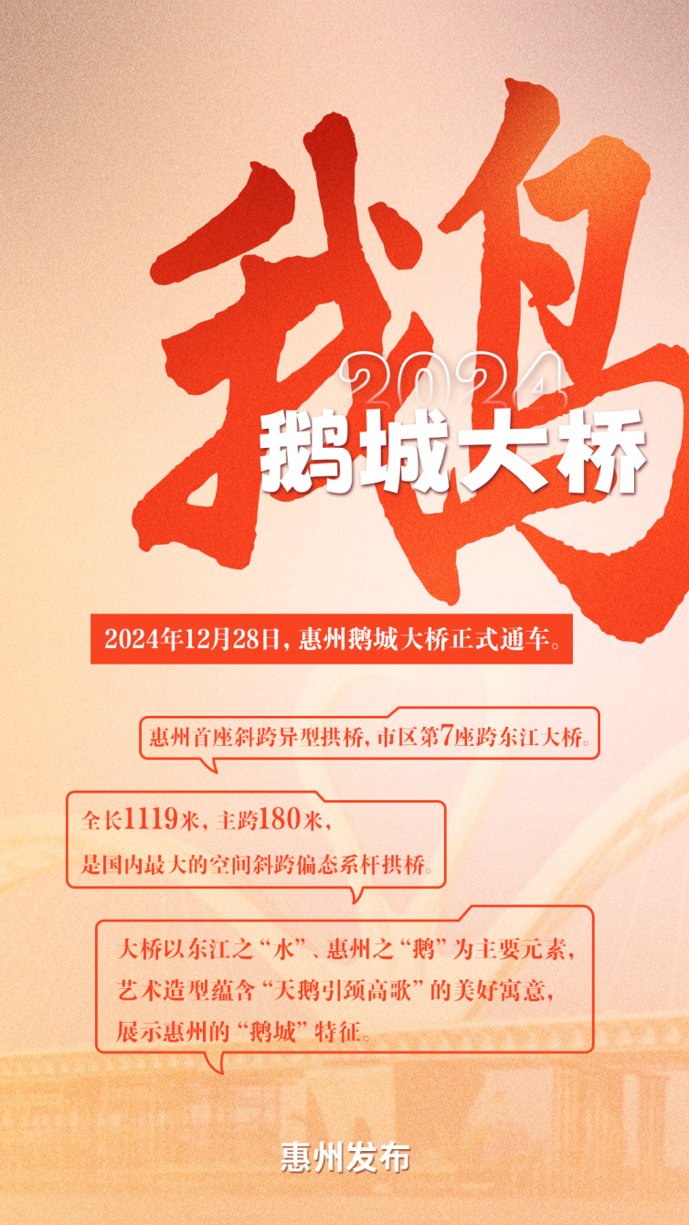 2024年12月28日上午,由中铁广州工程局承建的惠州鹅城大桥正式通车,标志着惠州“丰”字交通主框架进一步完善。大桥外观为两只白色天鹅相向之吻,艺术造型蕴含“天鹅引颈高歌”的美好寓意,是一座造型美学与结构力学结合的艺术桥梁。大桥通车后,将有效缓解东江大桥、隆生大桥的交通压力,加快形成城市东联、南接快速通道,成为联动东江两岸惠民兴业的新动脉。