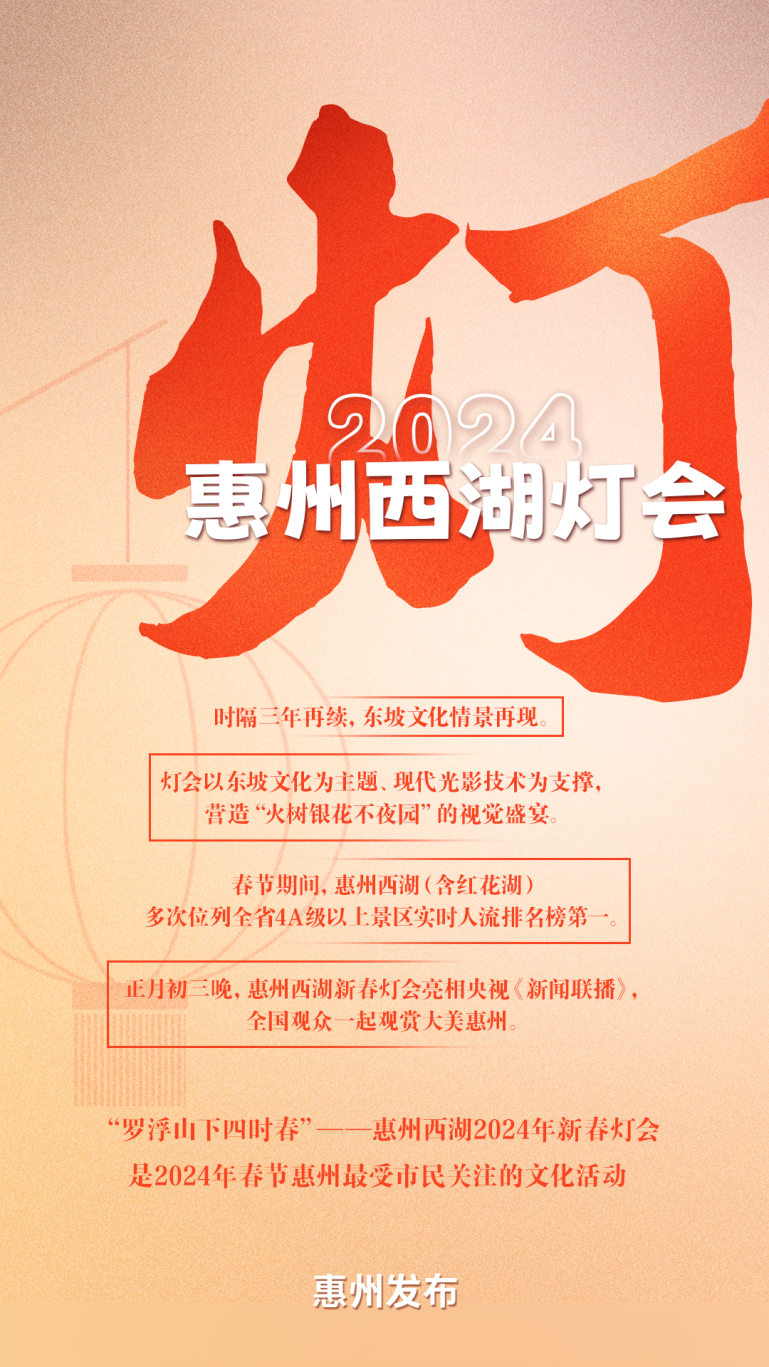 璀璨灯会,耀眼鹅城;西湖有幸,客迎八方。“罗浮山下四时春”——惠州西湖2024年新春灯会是今年春节惠州最受市民关注的文化活动。2024年春节期间,惠州西湖(含红花湖)多次在全省4A级以上景区实时人流排名榜位列第一,成为众多游客心目中的首选旅游目的地,其中18天灯会时段共接待游客62.06万人。