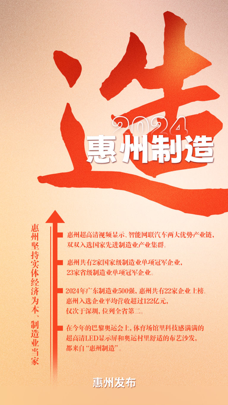 近年来,惠州以坚实的实体经济和蓬勃发展的制造业为根基,逐步成长为万亿工业大市。惠州超高清视频显示、智能网联汽车两大优势产业链,双双入选国家先进制造业产业集群。汽车电子、新能源产品(储能)、家用电器、运动器材、家居家具、音响乐器、美妆等优势产业迅速发展,展现了惠州强大的工业制造实力。